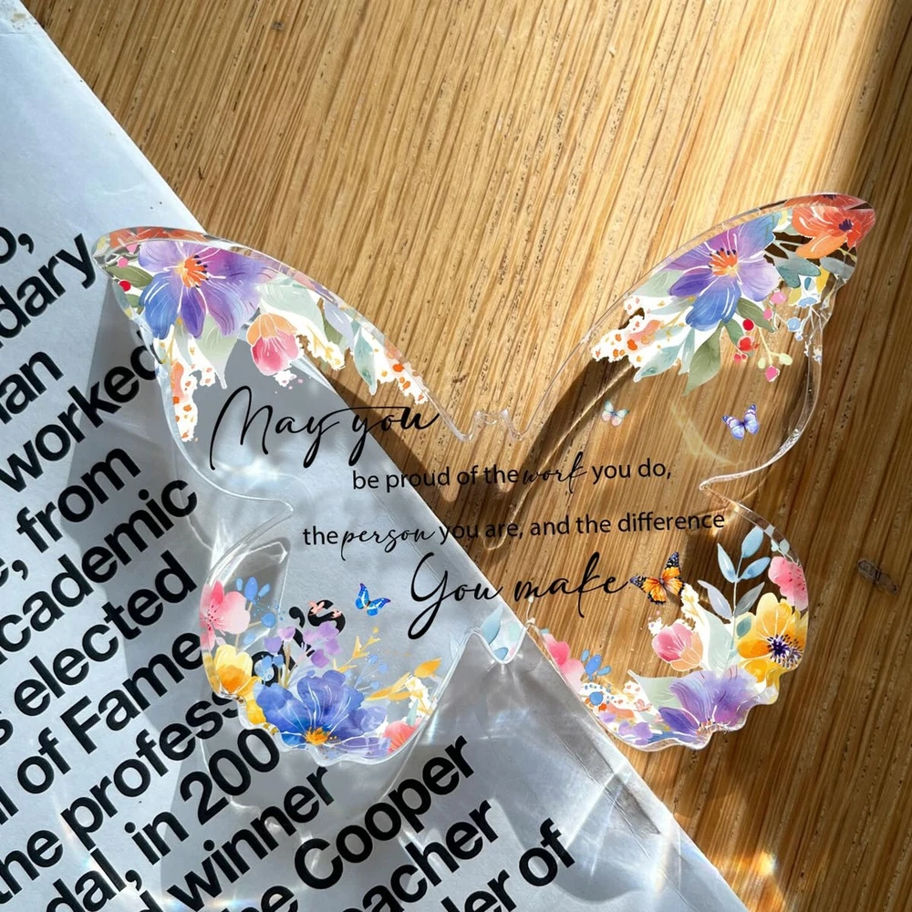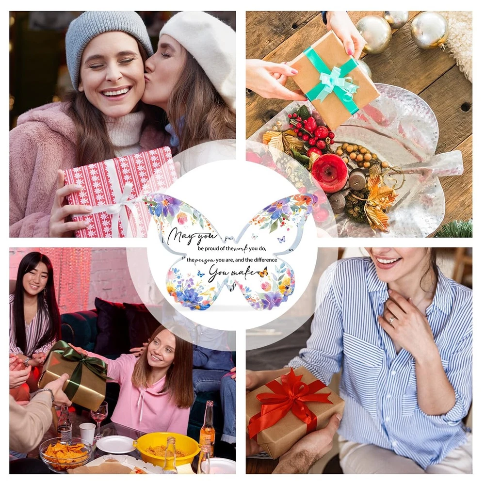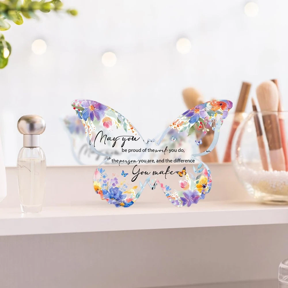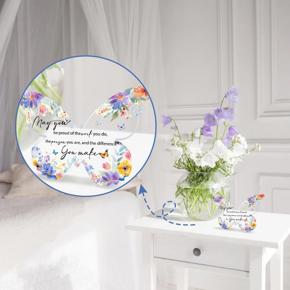 Thank You Gifts Plaque, Butterfly Gifts for Women, Office Desk Decoration Accessories, Inspirational Gifts for Women, Appreciation Gifts for Coworkers, Women, Teachers, Friends Product Details Color: Multicolor Brand: TAGDANK Material: Acrylic Theme: Inspirational Mounting Type: Free Standing Product Dimensions: 4.72"L x 3.15"W Style: Art Deco Item Weight: 1.6 ounces Manufacturer: TAGDANK Country of Origin: China Item model number: DM318 Unique Design & Suitable for All Occasions: The quotes surrounded by flowers. The thank you words and patterns printed on them are a source of praise and gratitude throughout the day. Each butterfly is unique, much like a human. Whether it's Christmas, a birthday, Mother's Day or an anniversary; their sentimental value and unique and thoughtful design make them a treasured keepsake for the recipient Inspire Positive Energy Gift: Designed to express gratitude, this acrylic butterfly ornament is a unique gift that can express warmth and kindness, and it says "Thank you for helping me grow and fly". It is an ideal thank you gift, which is perfect for thanking teachers, bosses, colleagues, friends or any special person in your life.. The pattern and words above show your belief deeply Lightweight and portable: butterfly gifts for women measure about 4.72 x 3.15 x 0.59 inches/ 12 x 8 x 1.5 cm, lightweight and portable, easy to store and display, they do not take up too much space on the table, they can stand stable on your table, shelf, counter, drawer, cupboard or any flat surface High-Quality : Made of quality acrylic, with clear printing and smooth surfaces, wear and tear resistant, which is reliable and reusable, and not easy to fade, deform or break for long term use and can be displayed on a desk, shelf, or wall for a lasting reminder of your gratitude.The stylish appearance adds a touch of sophistication to any space AFTER-SALES SERVICE: The package includes a box and an acrylic ornament. We provide after-sales service This clear acrylic sign is printed with beautiful design and meaningful saying, it is a good choice for your friends and families. It will be placed where it can be easily seen, it is a nice small office desk decor for women and will bring a good mood to them every day.