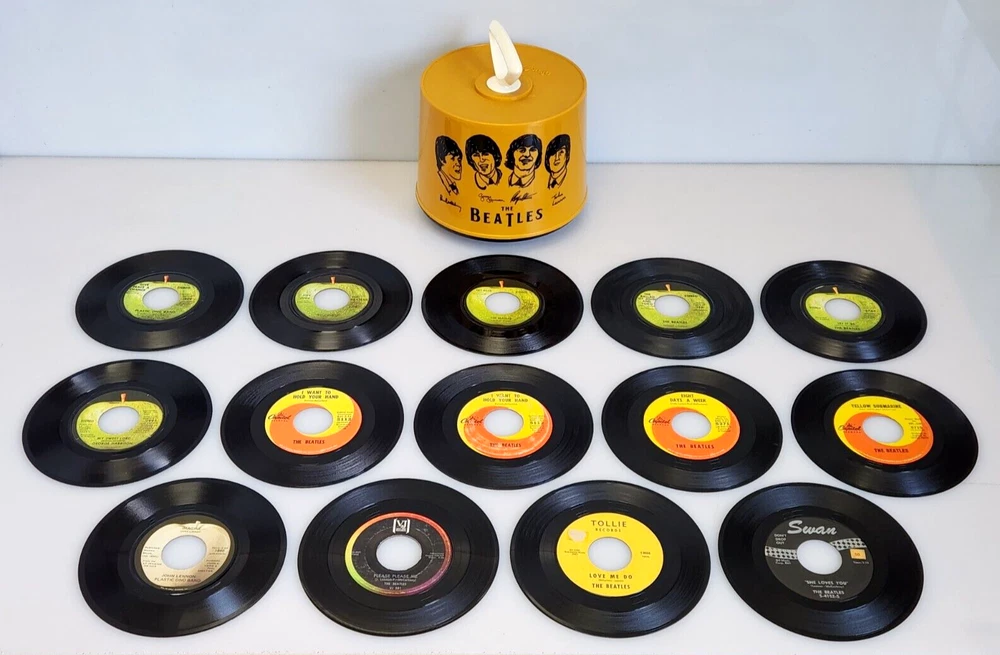 The Beatles Disk-Go-Case 1966 Nems Yellow 45RPM Vinyl Record Carrier, 14 Singles "Disk-Go-Case" 45 RPM 7" Vinyl Record Case The Beatles - Paul McCartney, George Harrison, Ringo Starr & John Lennon Yellow ©1966 NEMS Enterprises, Ltd. (missing sticker) 14x 7" Vinyl Single Records Included: The Plastic Ono Band - Give Peace A Chance / Remember Love - 1809 The Beatles - Hey Jude / Revolution - 2276 The Beatles with Billy Preston - Get Back / Don't Let Me Down - 2490 The Beatles - The Ballad Of John And Yoko / Old Brown Shoe - 2531 The Beatles - Let It Be / You Know My Name - 2764 George Harrison - My Sweet Lord / Isn't It A Pity - 2995 The Beatles - I Want To Hold Your Hand / I Saw Her Standing There - 5112 The Beatles - I Want To Hold Your Hand / I Saw Her Standing There - 5112 The Beatles - Eight Days A Week / I Don't Want To Spoil The Party - 5371 The Beatles - Yellow Submarine / Eleanor Rigby - 5715 John Lennon, Plastic Ono Band - Imagine / It's So Hard - 1840 The Beatles - Please Please Me / From Me To You - VJ 581 The Beatles - Love Me Do / P.S. I Love You - T-9008 The Beatles - She Loves You / I'll Get You - S-4152 Items are used with signs of wear. The Disk-Go-Case is in nice working condition and free of any cracks or other major damage. The "©1966 NEMS Enterprises, Ltd." stickers are missing from the front graphics. Ringo Starr's right eye sticker is starting to peel (see pic). There are light scuffs and dust due to regular use. The vinyl albums are all well worn with small scratches, dust and wear due to previous use. Includes only items pictured. Please view photos for more detail. Thank you 081624 NS AAJ-J2
