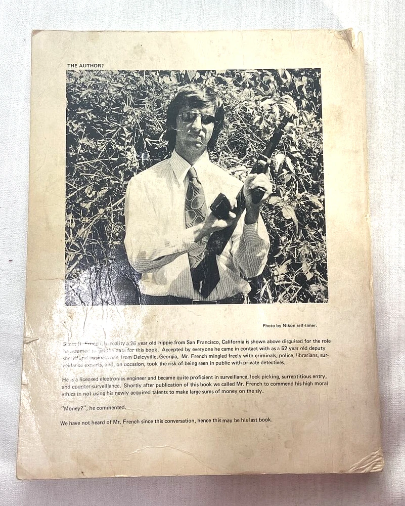 This trade paperback from titled The Big Brother Game by Scott French is a vintage first edition first printing publication. It contains 240 pages and covers topics related to privacy, intelligence, and espionage. The book is written in English and published by GNU Publishing in the United States.It is a must-read for those interested in law and political science genres. This book is in fair condition with wrinkles, staining and minor tears on the cover. There is also some staining on the last page. (see pics) Pages are in good shape with no marks or writing. Thank you