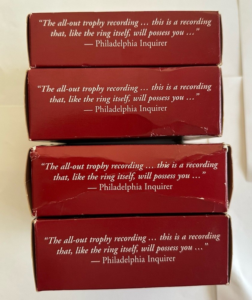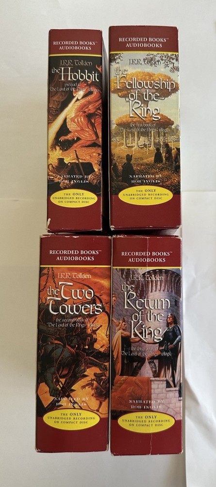 The product is a complete box set of 56 CDs containing audiobooks of J.R.R. Tolkien's "The Hobbit" and "The Lord of the Rings" series. Published by Houghton Mifflin Harcourt in the 1990s, this box set is designed for young adult and adult audiences, featuring an unabridged audio CD format with a run time of 63 hours. The narrative, set in the fantasy genre, follows the action-packed and adventurous stories of Middle Earth, making it a must-have for fans of literature and collectibles alike. Narrated by Bob Ingles, this box set is a valuable addition to any Tolkien enthusiast's collection. These LOTR box set audiobooks are complete with all discs and play great. The discs look like they were never played. The outer boxes do have some shelf wear mostly at the corners. There is a treat to the Two Towers outer boxes in the lower left corner. See all photos for details.