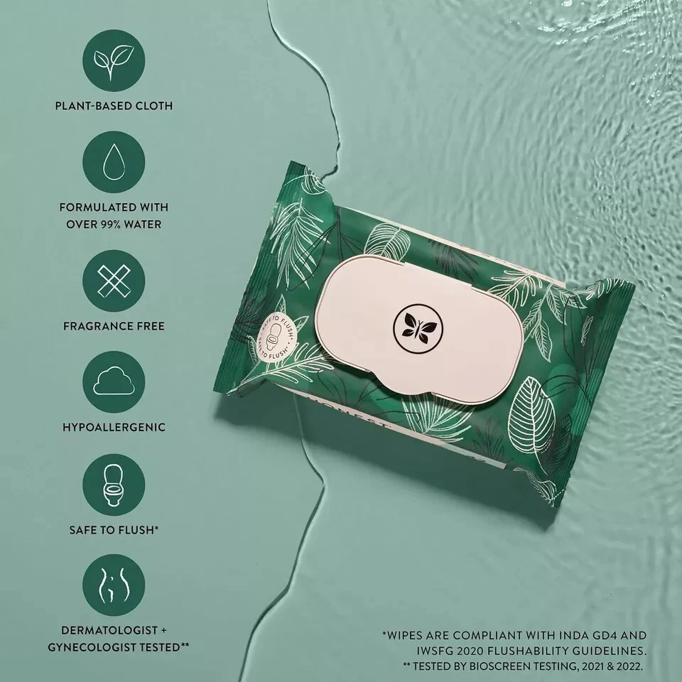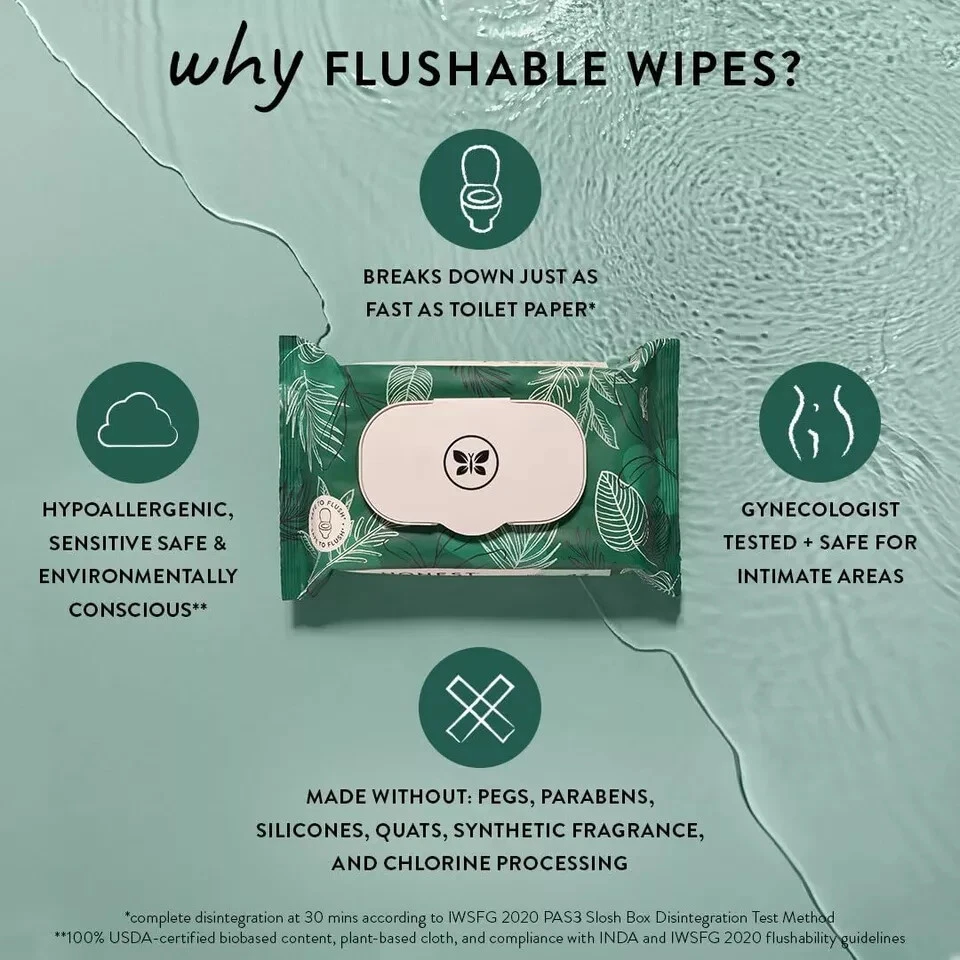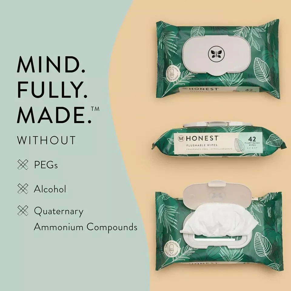 The Honest Company Plant-Based Flushable Wipes | 99% Water, Hypoallergenic , EWG About this item Worry-free flushing. Elevate your bathroom experience with our plant-based, fragrance-free Flushable Wipes formulated for sensitive skin and made with over 99% water Gynecologist and Dermatologist tested; pH Balanced so they don’t disrupt your natural pH Safe to flush cloths begin to break down as fast as toilet paper; For best results, flush one wipe at a time and do not exceed two wipes per flush Made with over 99% water; Fragrance-Free; Plant-Based; EWG Verified; Hypoallergenic; Cruelty Free Made without: plastic, fragrances, PEGs, chlorine processing, quaternary ammonium compounds, alcohol