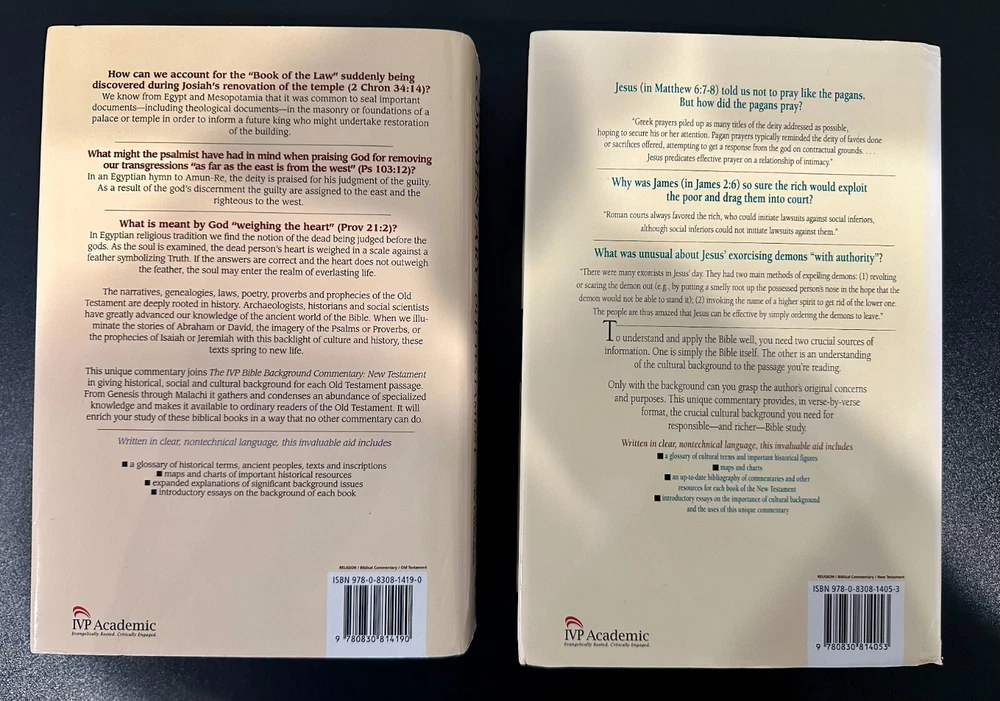 The IVP Bible Background Commentary: Old Testament by John H. Walton, Victor H. Matthews, and Mark W. Chavalas / The IVP Bible Background Commentary: New Testament by Craig S. Keener (Hardcover). An Indispensable Resource for all Students of the Bible, Accessibly Providing the Cultural Background of Every Verse in the New Testament. Ships free via USPS Media Mail.