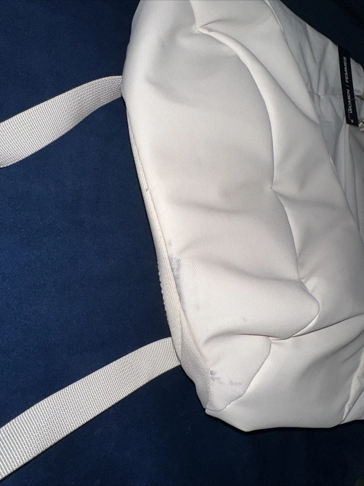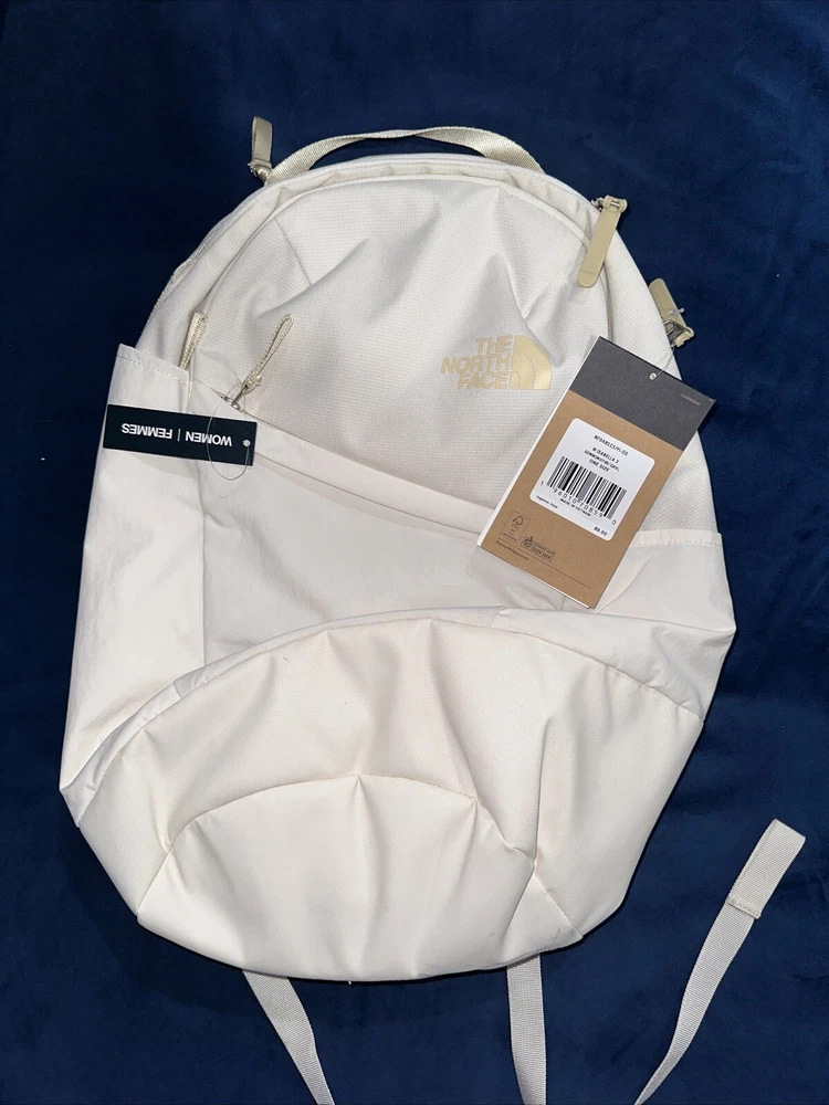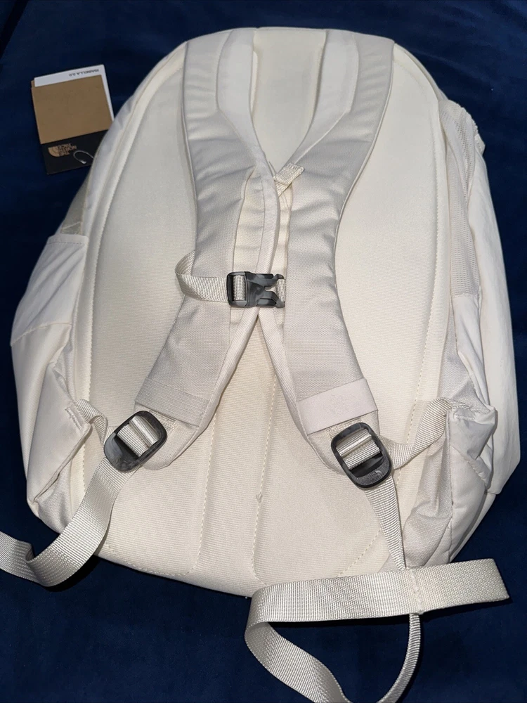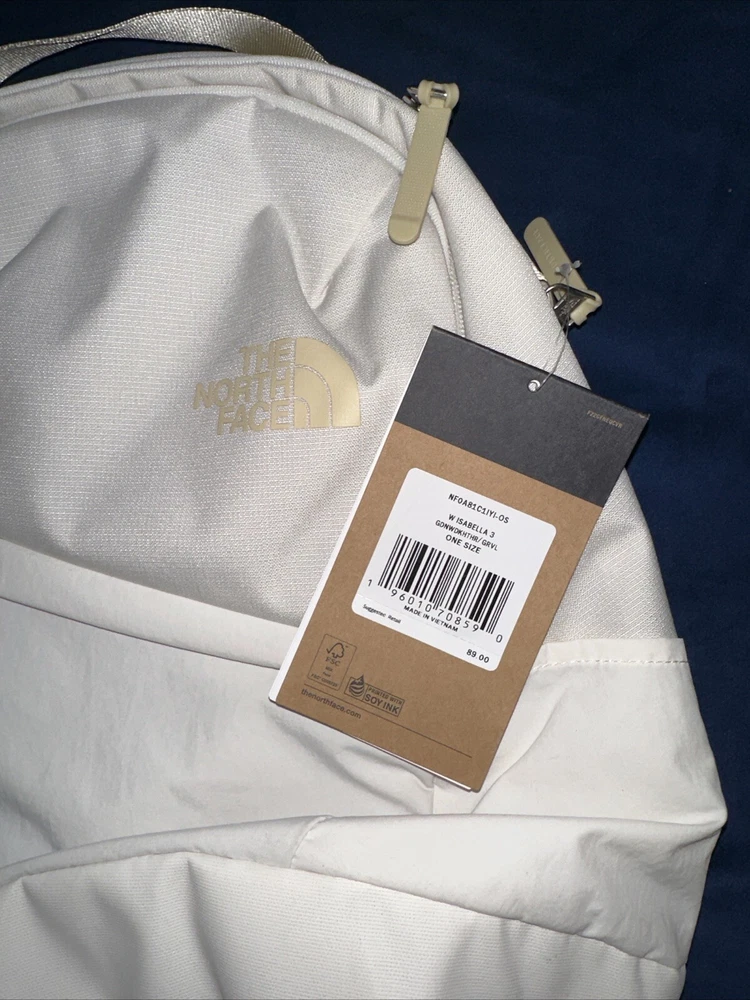 This beautiful white backpack from The North Face is perfect for any outdoor adventure or casual day out. The large size and rectangular shape make it easy to carry with the adjustable shoulder strap and padded features. The backpack includes a zippered closure with the brand's logo accent and several pockets for storage. The interior lining is made of beige polyester and features a laptop sleeve for protection. The backpack is personalized with the character Isabella and is part of The North Face Isabella 3.0 product line. Whether you're traveling or just need a reliable bag for everyday use, this backpack is a great choice. Small stain on bottom