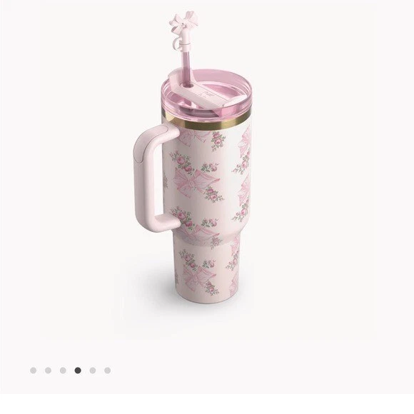 The original oversized bow that sparked LoveShackFancy’s love for the flourish in all areas of its rose-colored world is shown in its signature blush pink and gentian blue. Romance returns with LoveShackFancy’s signature oversized bows. With intricate patterns and gilded accents, the Quencher is ready to sip fancy and festive this holiday season 18/8 recycled stainless steel Double-wall vacuum insulation FlowState™ 3-position lid Reusable straw Car cup holder compatible Dishwasher safe BPA-free New in box- unopened