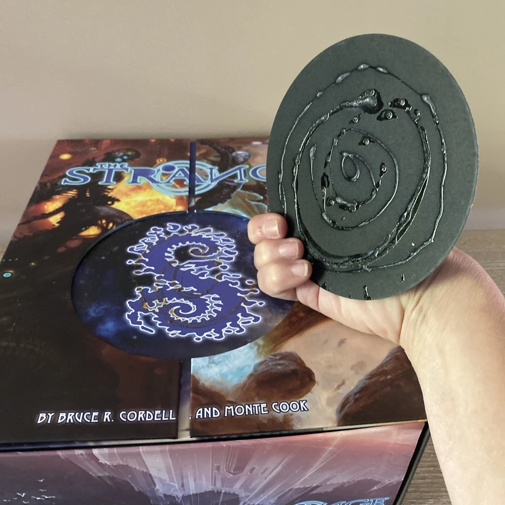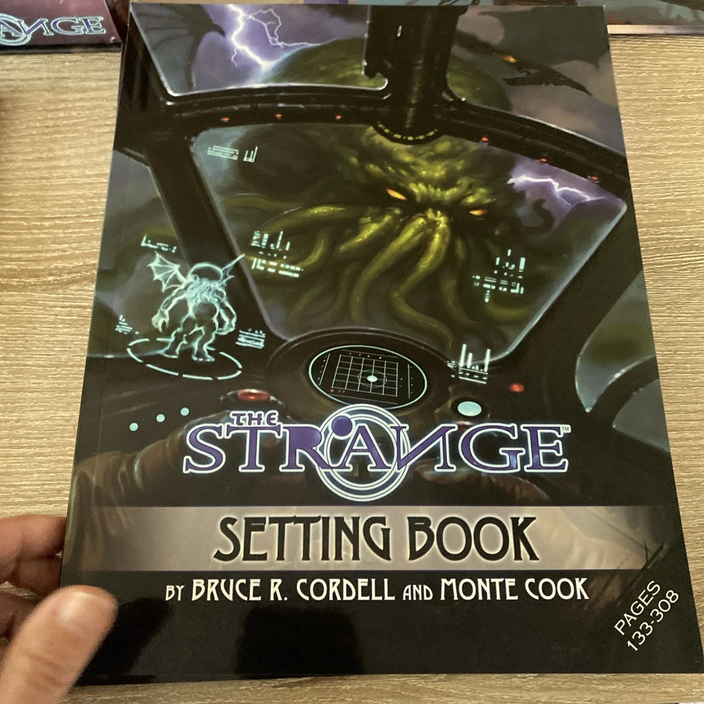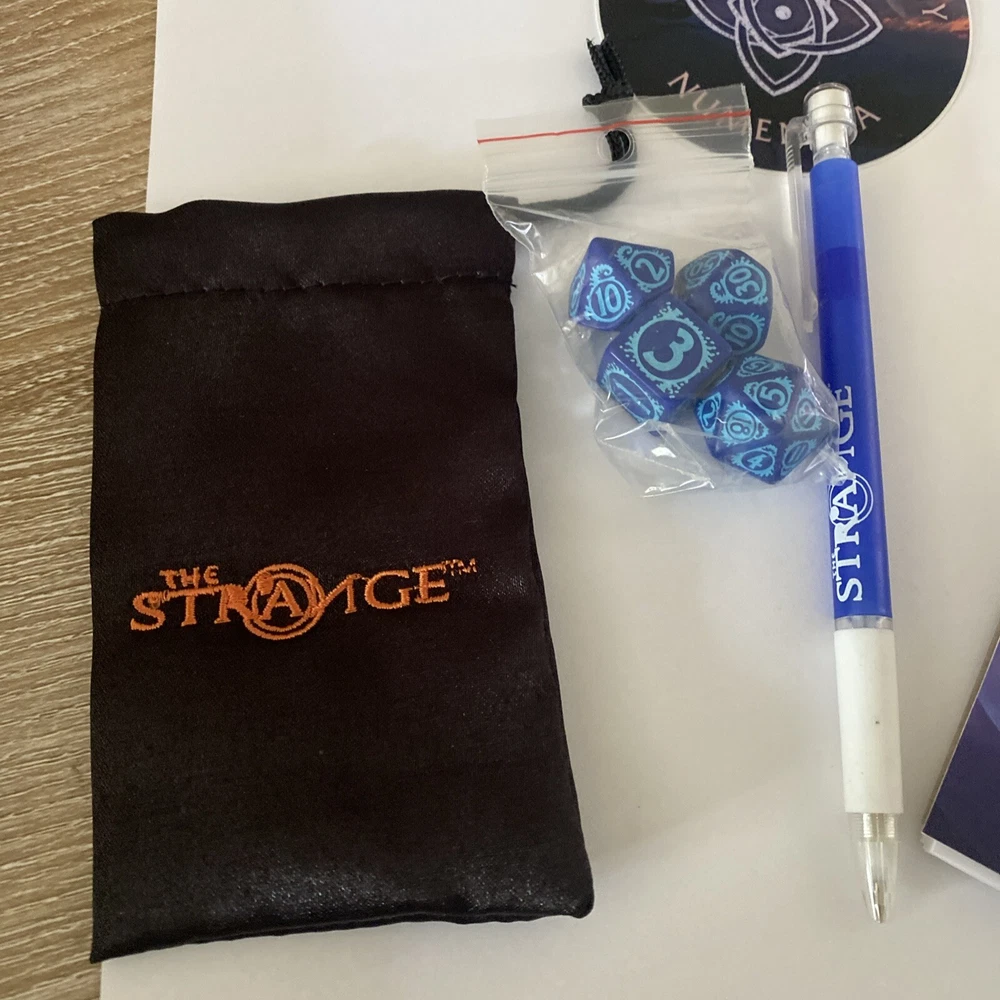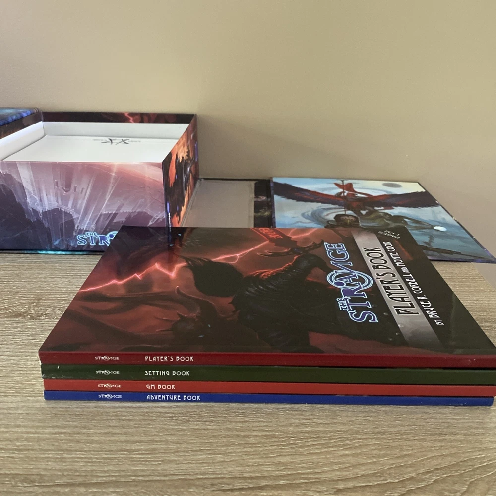 The Strange RPG is where stories, movies, myths, novels and even comics and games come alive in limited alternate dimensions called recursions. Player characters explore these excursions, accumulate treasures and wonders, and defend the Earth from entities they discover who are jealous of - or want to consume - the real world. Recursions float in a medium that scientists call dark energy, but that PCs call the Strange. The Strange was nominated for the Origins Award for Best New Roleplaying Game and received 2 ENnie awards, including awards for best setting, best game and best art. This box set has been opened and does have damage the seal came off but can be glued back and there is a tear on the bottom of the box (see pictures) but all items inside the box are new, all cards are still in original plastic packaging. Please see pictures for all items included in this exclusive box set.