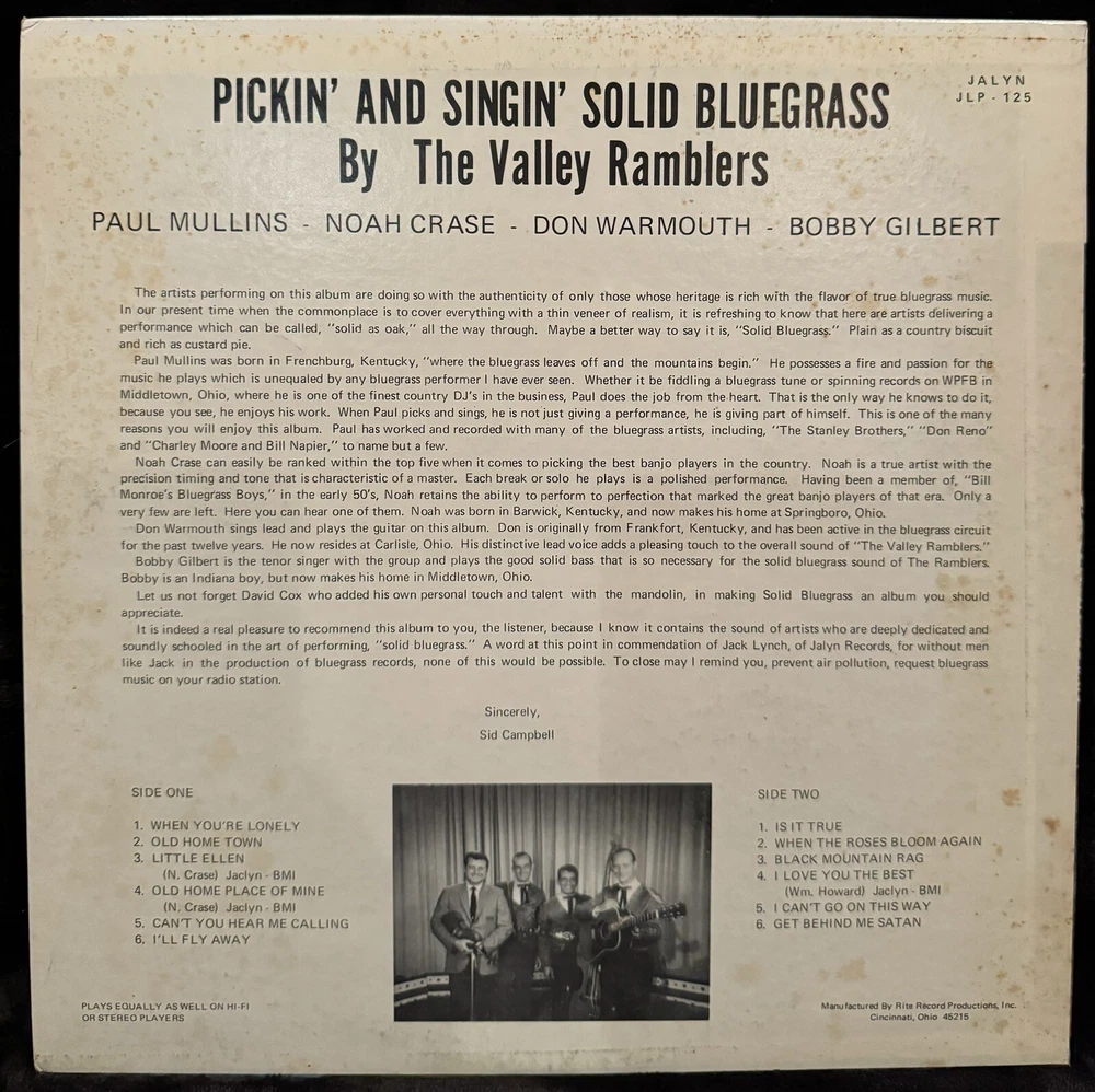 The Valley Ramblers Pickin’ And Singin’ Solid Bluegrass 1969 US Lp. Jacket & Vinyl are both a solid VG+. Cane from a killer collection. I pack safely & securely in reinforced vinyl mailers. I pack how I want to receive.