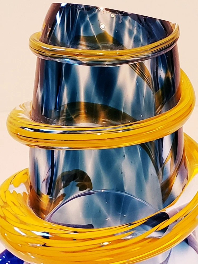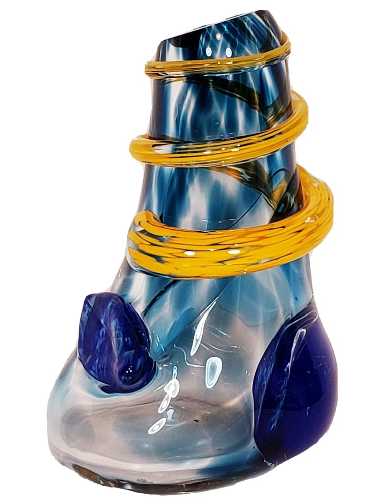 Art Glass Heavy Thick Vase Funky Yellow Blue wrapped . Wild looking yellow wrapped stretched top 8" x 5" half inch thick very funky cool look . Very tiny flea bite on the top upper edge besides that very good condition no chips or cracks just a great design.