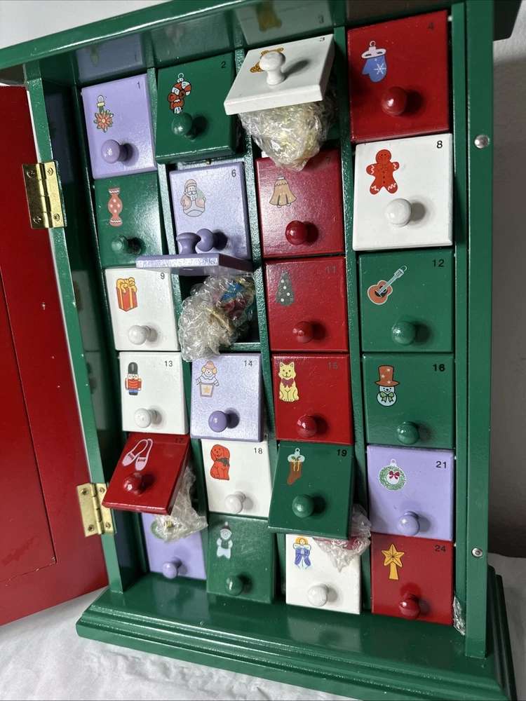 Get ready for the holiday season with this beautiful Thomas Pacconi Classics Christmas Countdown Box Advent Calendar. Made of high-quality wood, this rectangular-shaped calendar features a festive multicolor design that is perfect for any Christmas occasion. The calendar was manufactured in 2004 and comes with ornaments, making it a great addition to your home decor . All 24 advent calendar surprises NEW and hidden behind each door!
