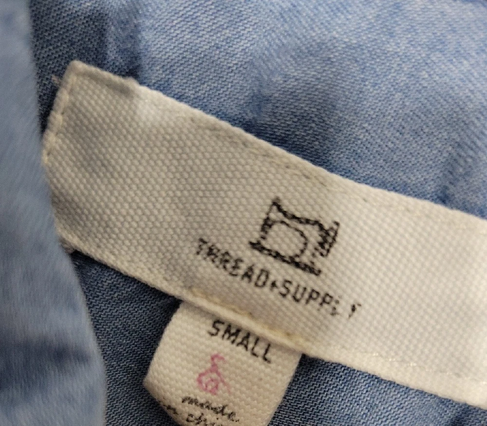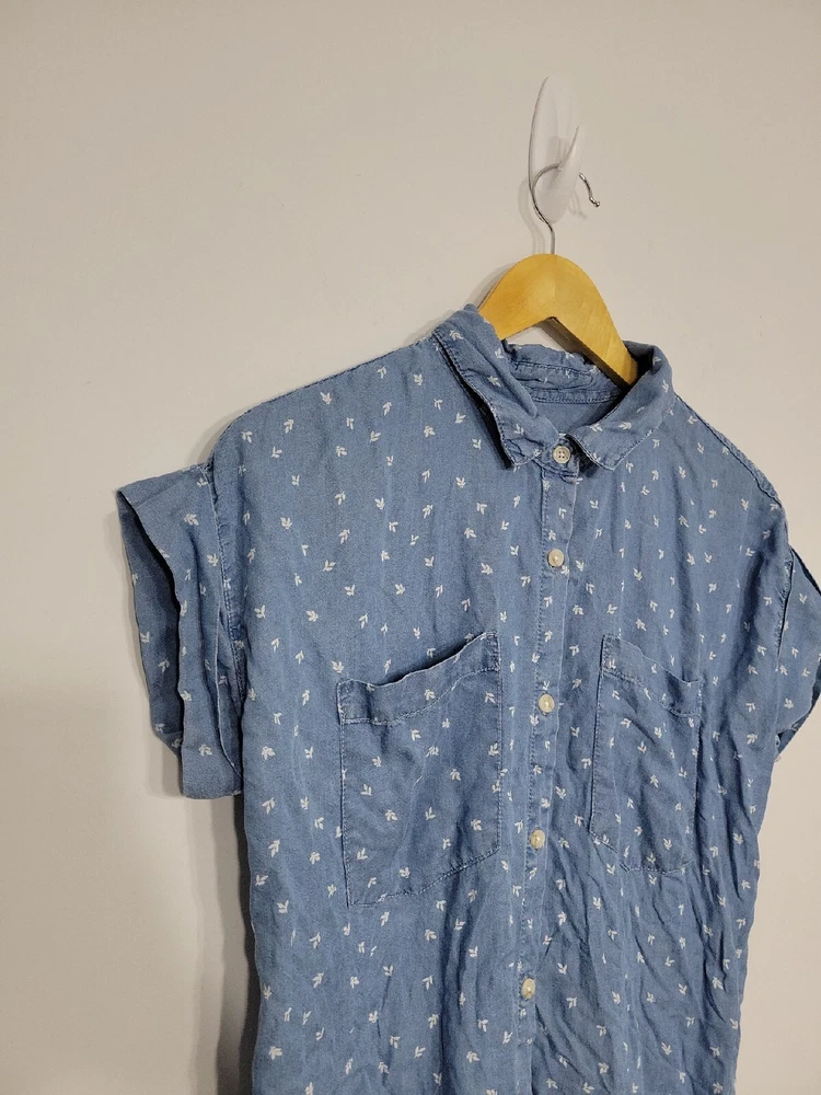 Thread & Supply Women’s Dress Size Small Button-up Fringe. Pre-owned great condition 100 percent lyocell Rolled stitched sleeve button-up t-shirt dress style with leaf detail print 34 inches long 20 inches across 2 front pockets G4F