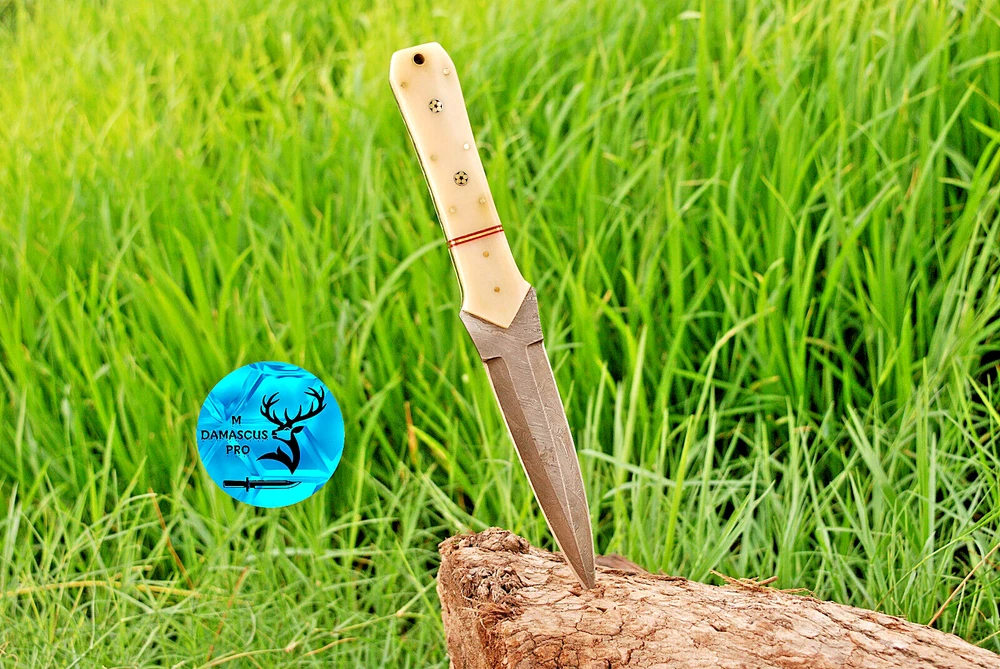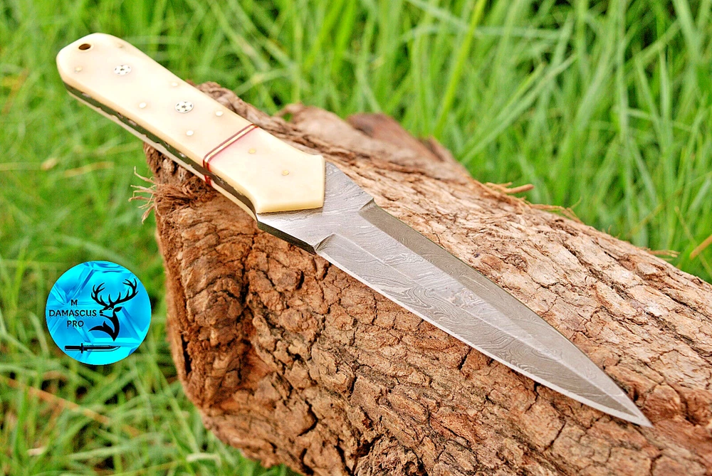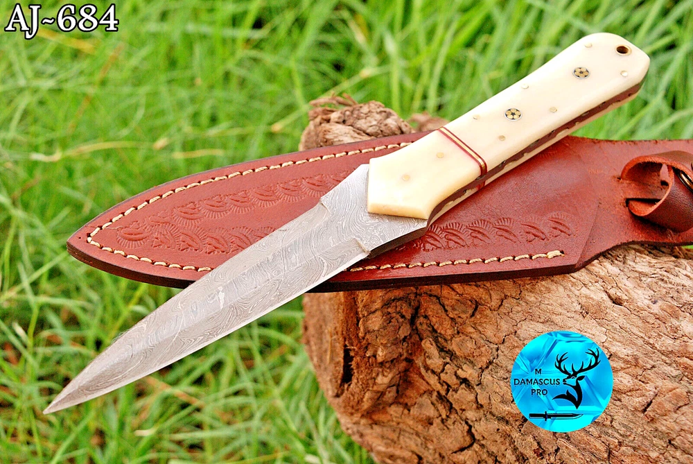 CUSTOM MADE HAND FORGED DAMASCUS STEEL BOOT DAGGER HUNTING KNIFE This superb design knife is hand forged. Blade of this knife has a nice file work and is made of 512 layers of 4340 stainless steel and 1075 high carbon steel and hardness 55-58 HRC . This robust knife is lab tested under intense conditions, the balance and shape of this knife ensures perfect grip. Overall Length: 9" Inches Blade Length: 4.5" Inches Handle Length: 4.5" Inches Damascus Design: Twist Pattern Layers: 512 Sheath: Leather Hardness: 55-58 HRC Package Includes: with Sheath Care Instructions: Keep the knife dry after each cleaning. Warning: Take care when removing product from packaging. Keep fingers clear of blades. Store away from children.