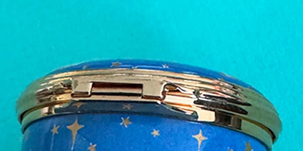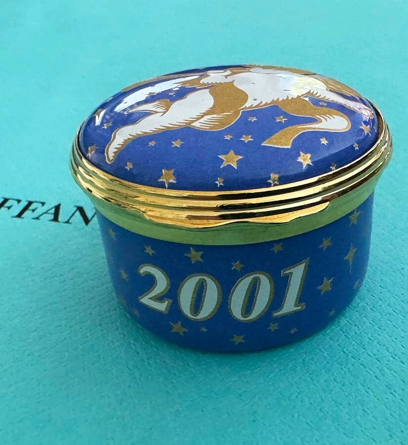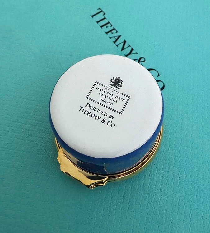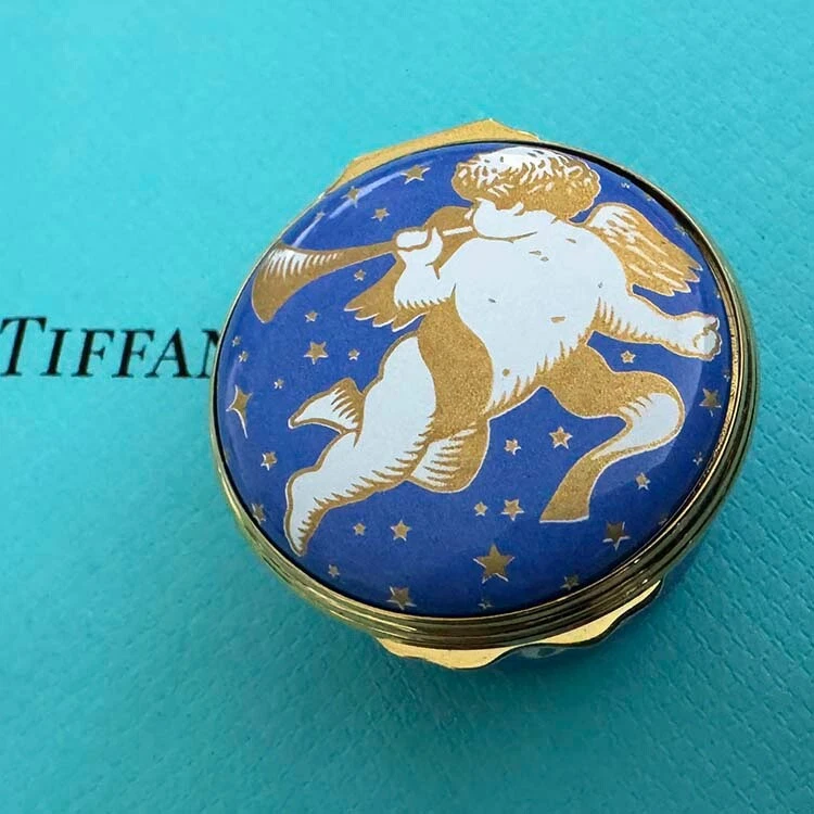 ** CELEBRATE THE SEASON....FESTIVE VINTAGE HOLIDAY MAGIC.... *Wonderful... TIFFANY & CO DESIGNED ARTISTIC... HALCYON DAYS ENAMELS 2001....With Baby CHERUB DRAPED IN GOLDEN RIBBONS PLAYING A GOLDEN HORN...CELEBRATION! CHRISTMAS...HAPPY NEW YEAR!...CHEERS! Artistic...Lovely Blue with Gold Stars, Ribbons, Creamy Light Cherub...Handsome Golden Metal Detailings... Golden Horn, Ribbons, Stars on inside lid... Year: 2001 on the side. HAPPY NEW YEAR! Printed on the Bottom of Small Trinket or Pill Box: HALCYON DAYS ENAMELS ENGLAND DESIGNED BY TIFFANY & Co. Enamel, Quality Hand Crafted, Hinged Small Round Trinket Box Made in England. Comes with Small T&Co Blue Box. NICE Pre-Owned Condition. Little Light wear. Hinge works fine...Closes well. **PLEASE see Photos above as part of the description. Porcelain Trinket Box only. (**No Presentation Box**) Carefully wrapped for shipping via Mail. No International Shipping. Shipping in US only. TY. Thank you for looking! * HAPPY ALOHA HOLIDAYS!*