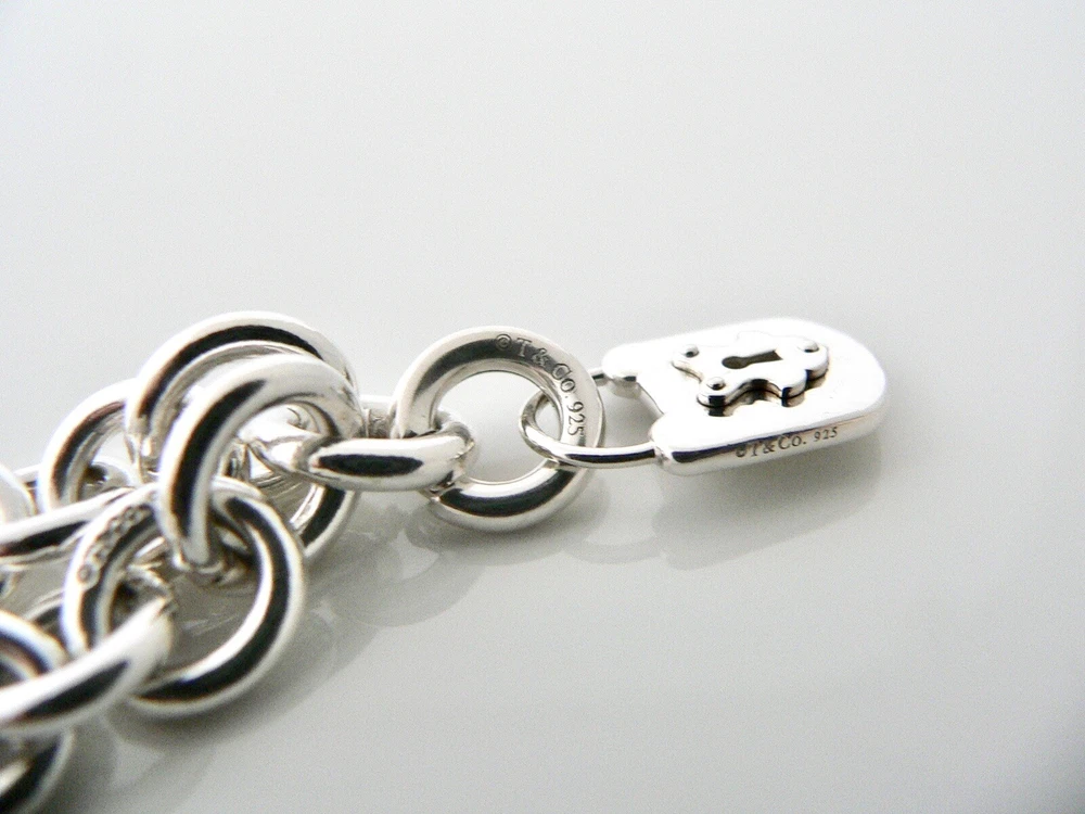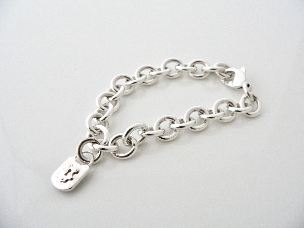 Overview: Offered for sale is a wonderful and gorgeous Tiffany & Co. Sterling Silver Keyhole Padlock Bracelet. Definitely a Tiffany piece that you will get your money's value for. It works perfectly with pretty much any attire your put on, AND is a great statement piece. The piece looks fabulous worn alone, but is also a wonderful piece with which to start or add to your Tiffany collection. The Keyhole padlock charm is attached to the bracelet with a removable Circle clasp, so the charm can be very easily used as a necklace pendant too! Very versatile indeed! This piece is simple, elegant, and classic all rolled into one bracelet. Imagine wearing the piece with your office attire... now imagine it with jeans or weekend wear ... Perfect anytime! It is a perfect Tiffany piece to start or add to your collection. As always, the item is hallmarked and guaranteed to be 100% authentic. Wonderful present for yourself or anyone you love! Will surely delight! Particulars: Size & Measurements: The bracelet is approx. 7.25 inches from end to end. Metal & Hallmarks: T & Co . / 925 (on Keyhole charm and middle link of bracelet) T & Co / 925 (on clasp) Solid 925 sterling silver Please check out my other unique and interesting Tiffany items on sale.