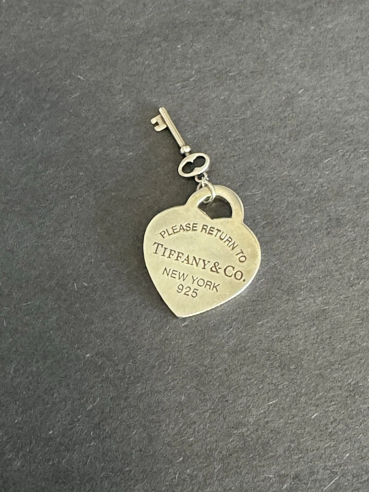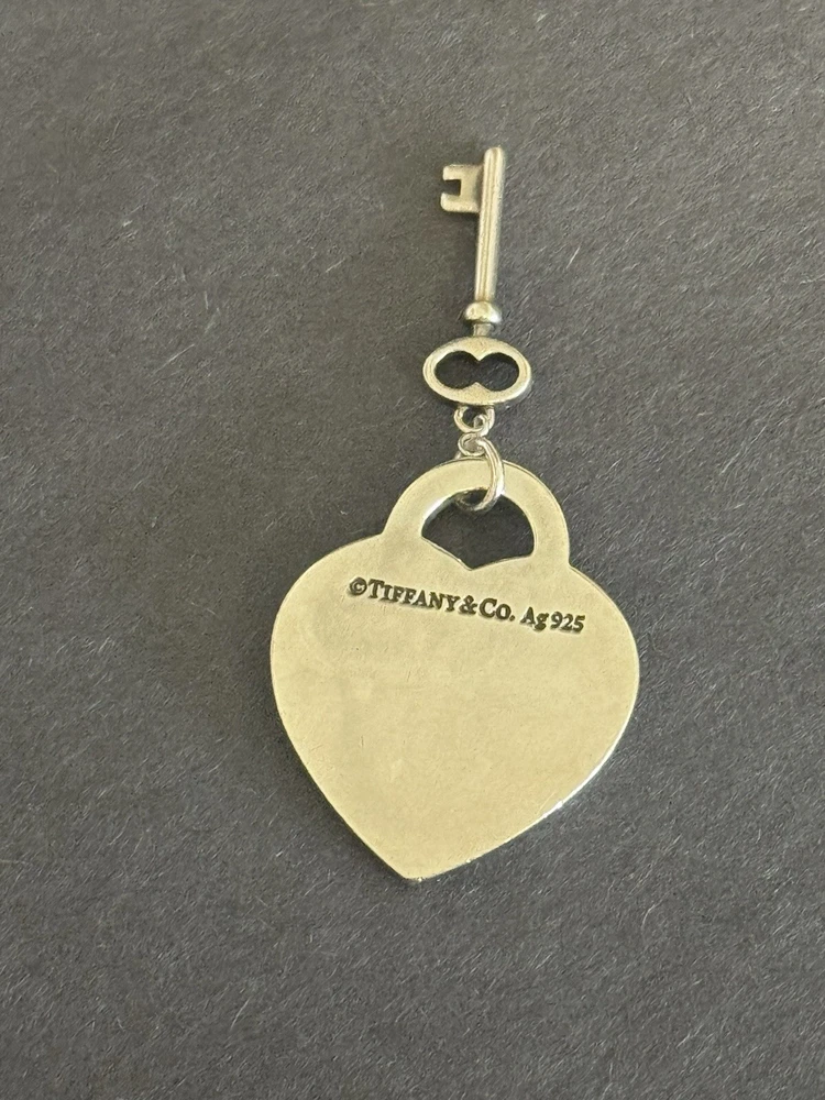 Show your love with this stunning Tiffany & Co. heart tag with key pendant. Crafted from 925 sterling silver, this charm is a must-have for those who love hearts. The pendant is signed by the famous brand and features a heart shape without any stones. The silver color of the pendant adds to its elegance, making it suitable for all occasions. The pendant is part of the Tiffany & Co. Hearts collection and is a perfect gift for your loved one. It is a fine jewelry piece that will never go out of style. Final sale No international