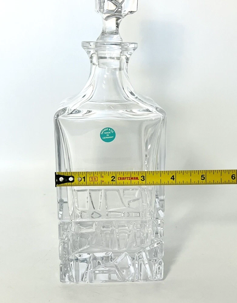 WE PREFER that you make an informed decision prior to making the purchase so that we don't have to CANCEL ANY ORDERS FOR ANY REASON! SO ASK QUESTIONS... SEND US YOUR ZIP CODE FOR ACCURATE SHIPPING QUOTES BECAUSE EBAY SHIPPING QUOTES ARE OFTEN WAY TOO HIGH THE ITEM PICTURED IS THE ITEM YOU WILL RECEIVE Description: Tiffany & Co. Sierra Crystal Clear Decanter Name Etched Authentic NEW No Box Tiffany & Co. Clear Sierra crystal decanter. This decanter features a textured design to the rectangular body and a faceted stopper. Embellished with crystal cut patterns along the bottom and stopper. Stickered and etched "Tiffany & Co."; the underside bears the maker’s acid etched mark. CIRCA: 20th Cent. ORIGIN: GERMANY DIMENSIONS: 3.75"W x 11.5"H x 3.75"L x 7.5"D WEIGHS: 4.4 lbs NEW with no BOX or paperwork, sticker attached. Comes from a smoke free home. Please see photos for details. We are happy to accept returns if need be. Please note that we will provide a return shipping label and will deduct the cost of the label from the refund upon receipt of the item in the same saleable condition. BUYER PLEASE READ THE FOLLOWING BEFORE BIDDING/BUYING: EBAY PAYPAL and CASH PAYMENTS ONLY SHIPPING - Again, please send me your zip code and I will provide you with a more accurate shipping quote. Seems like Ebay sometimes inflates what buyers see as far as calculated shipping. WE WILL DO OUR BEST TO COMBINE SHIPPING WHERE POSSIBLE - WE RESERVE THE RIGHT TO LIMIT COMBINED SHIPPING IF ITEMS ARE TOO HEAVY OR FRAGILE. KM-Marcus- hallway bottom shelf to garage