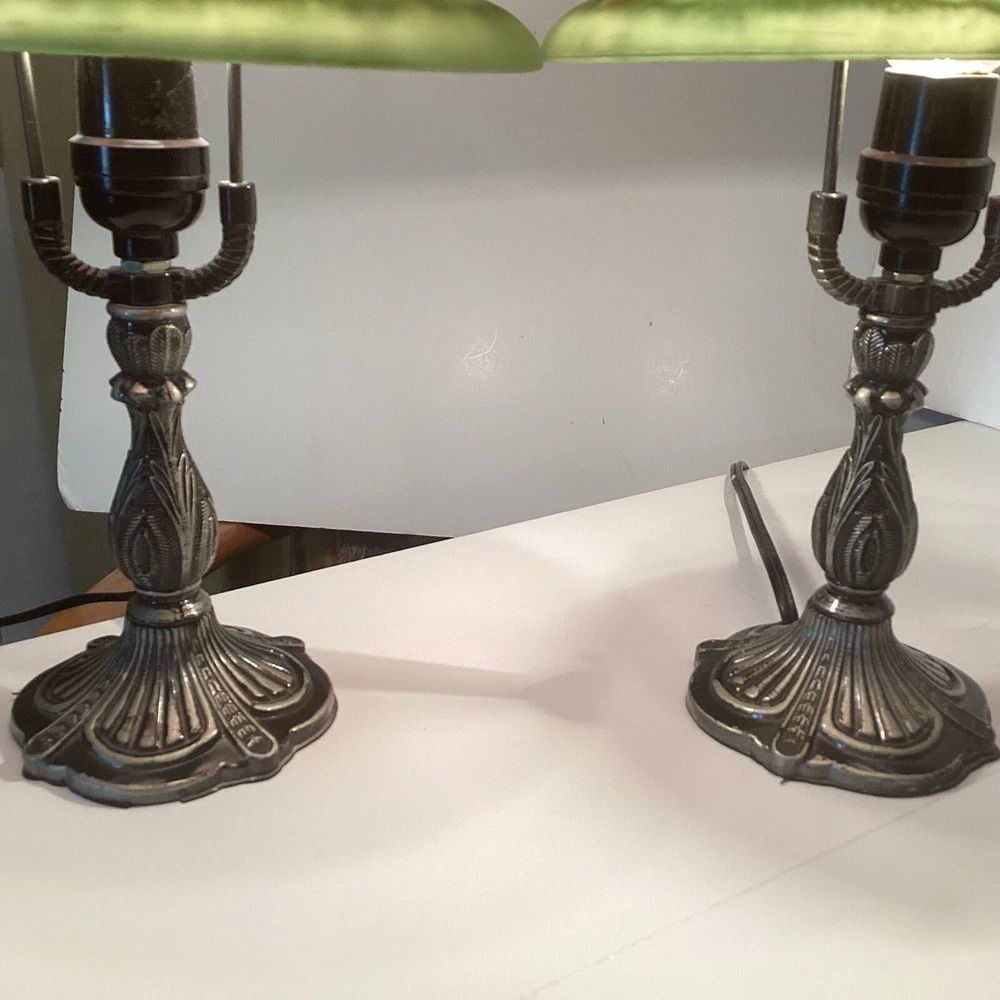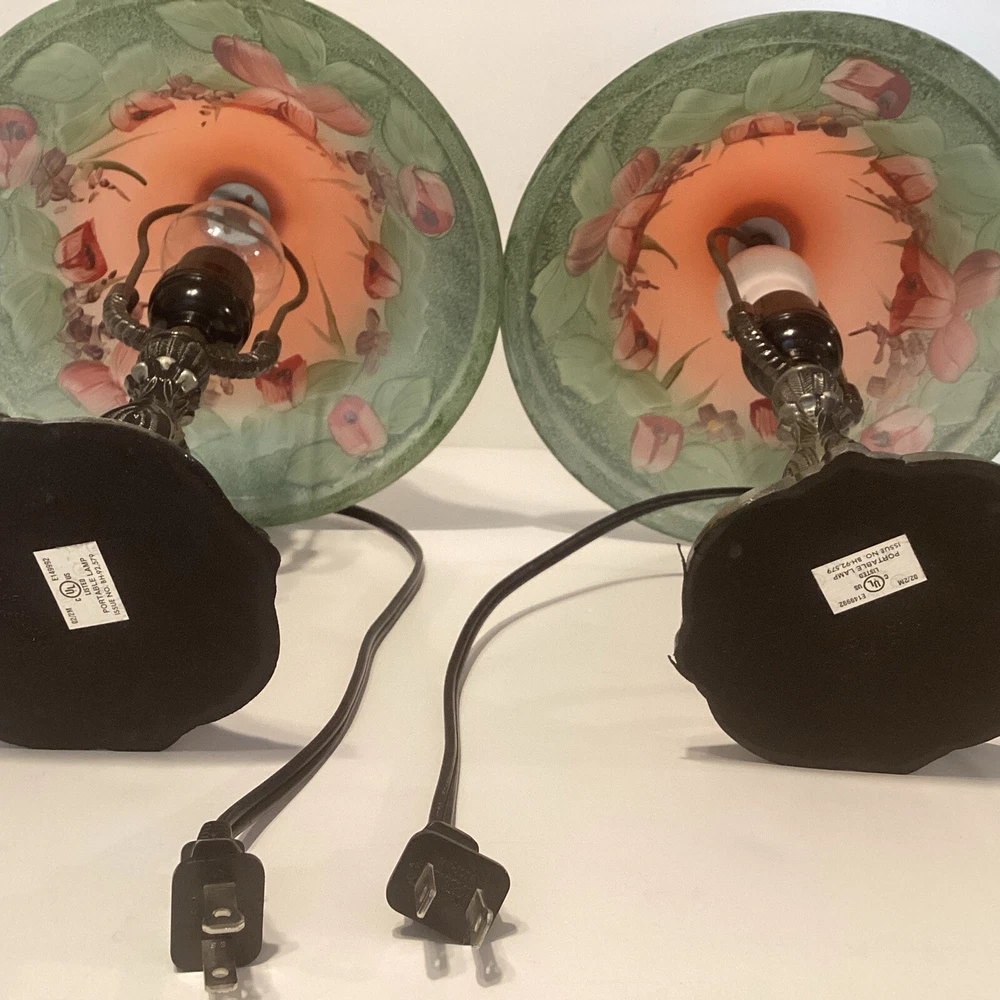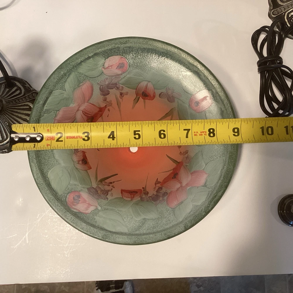 Very good preowned condition Measurements are in pictures Will be packed very carefully Floral glass shade Ornate metal base very detailed Approximately 14” H Please feel free to reach out with any questions