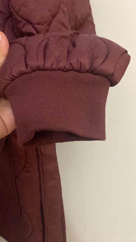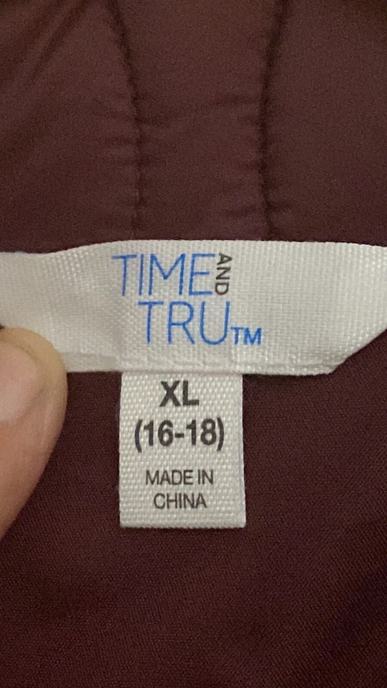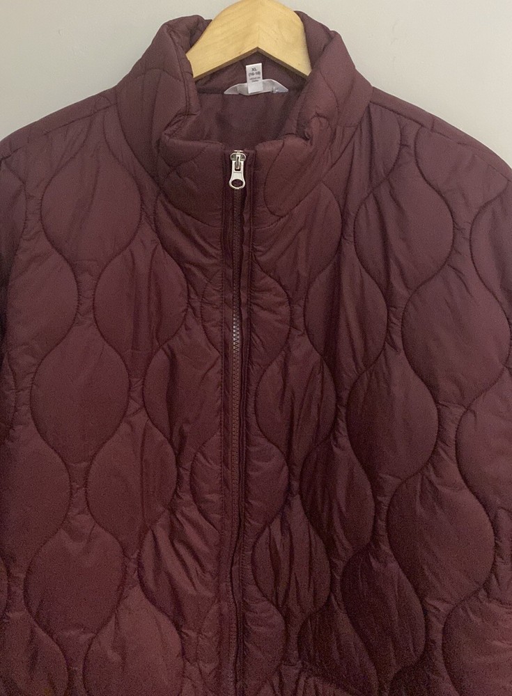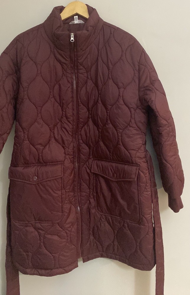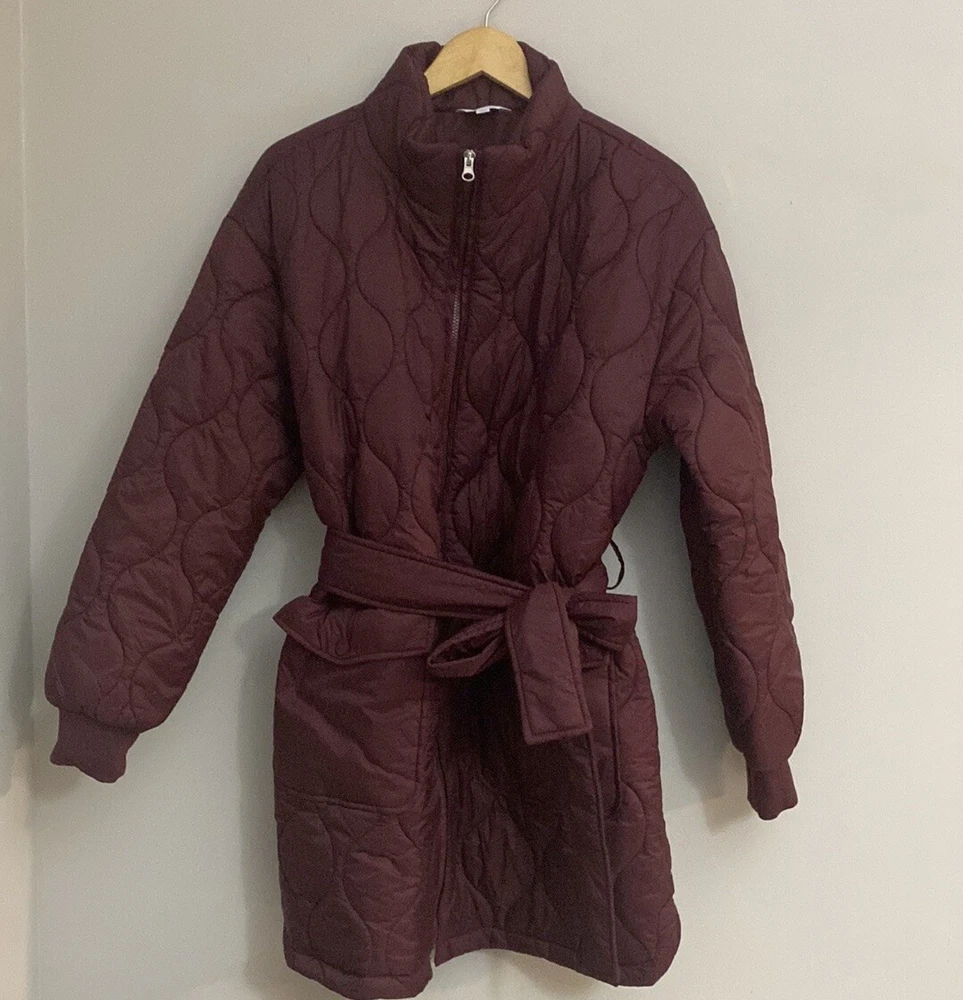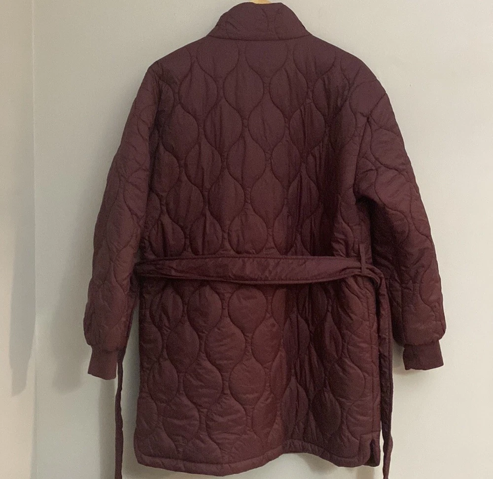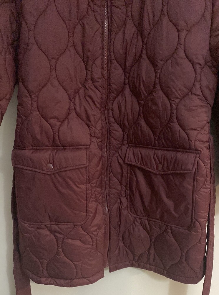 Time and Tru womens Burgundy puffer Onion Belted Barn long Coat in good condition full zipper front pockets size XL Pit to Pit 24 in Long 35 in