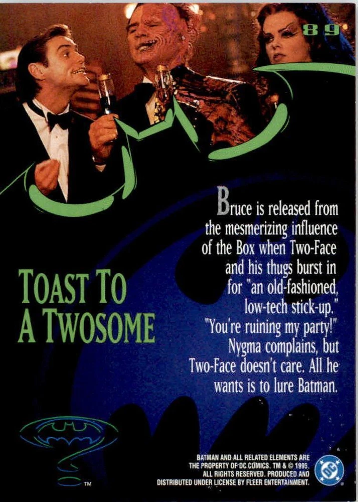 Franchise: NON_SPORT Graded: No Type: Non-Sport Trading Card Set: 1995 Ultra Batman Forever Autographed: No Year Manufactured: 1995 Season: 1995 Player/Athlete: Toast to a Twosome Card Number: 89