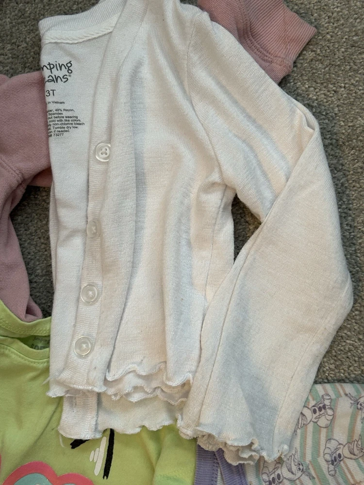 All smoke free items , no stains or rips. This lot of toddler girl clothes in size 3T includes 7 pieces with a multicolor theme for playtime. The set consists of a sweater, dress, hoodie, underwear, casual shirt, and features easy care, comfort, and stretch. Suitable for all seasons, these Jumping Beans brand items are machine washable and in good condition.