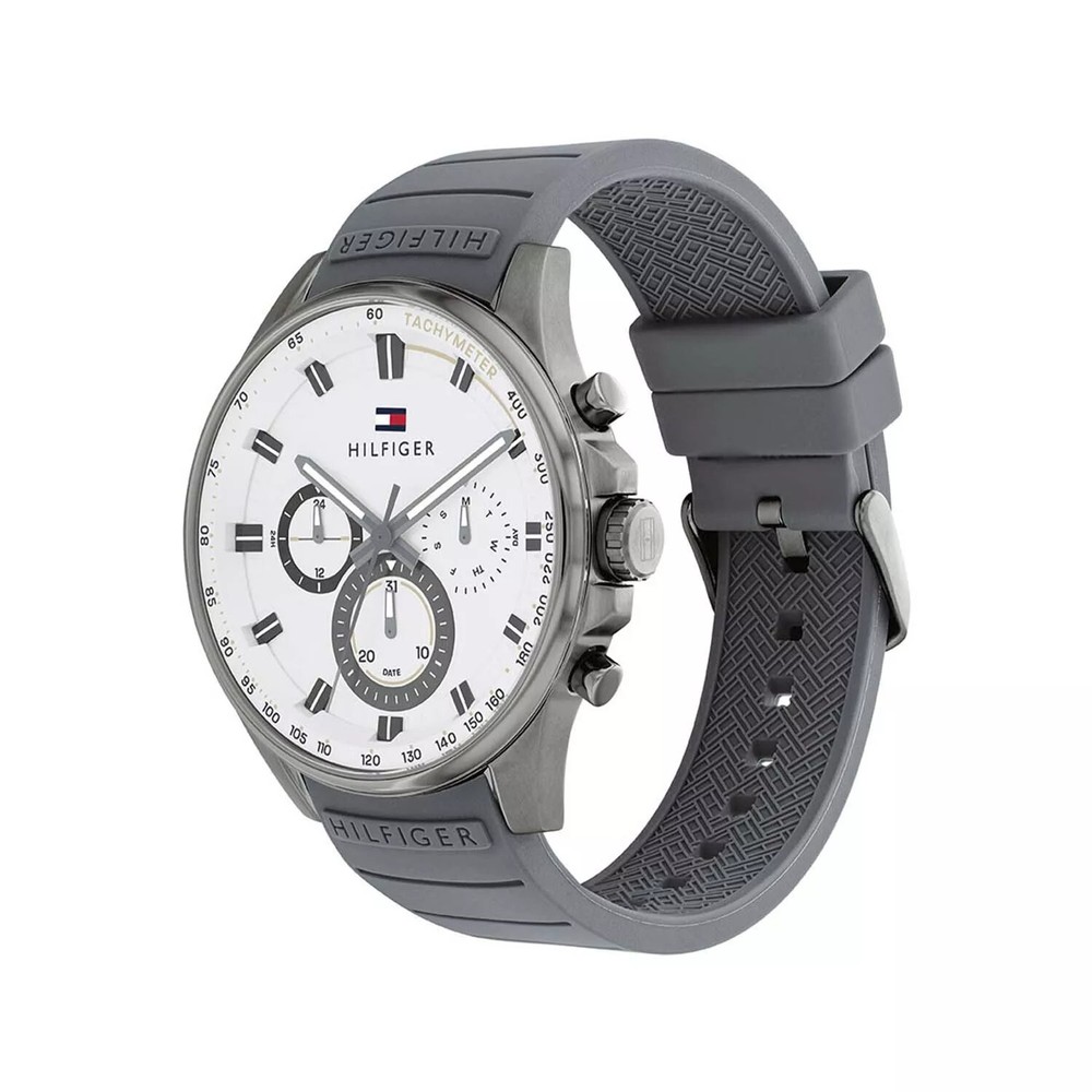Item Brand Tommy Hilfiger Series Max Gender Men's Model 1791972 Brand Origin USA Case Case Size 45mm Case Thickness 10mm Case Material Stainless Steel Case Color Grey Case Shape Round Case Back Solid Dial Dial Color White Crystal Scratch Resistant Mineral Crown Pull / Push Bezel Fixed Bezel Color Grey Bezel Material Stainless Steel Movement Movement Quartz Band Band Material Rubber Band Type Strap Band Width 21mm Band Color Grey Clasp Tang Additional Information Water Resistance 50 Meters / 165 Feet Functions Day, Date, Hour, Minute, Second Watch Style Dress Warranty 2 Years Also Known As 1791972