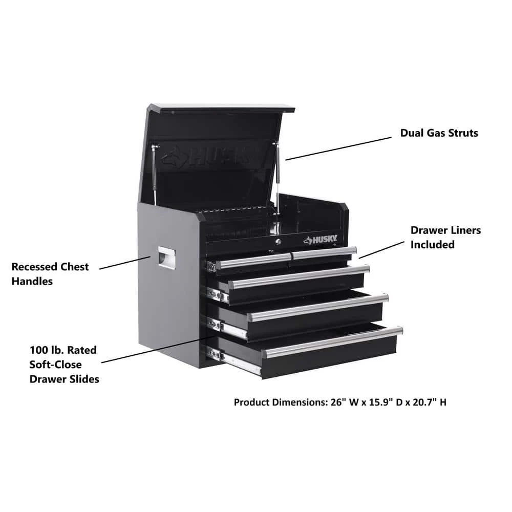 Features 5 drawers for ample storage space Made from premium,grade steel for long,lasting durability Internal locking system and keys enhance the securityMake the best use of your garage with the efficiently designed 26 in. 5,Drawer Tool Chest in Gloss Black. Great for holding heavy equipment, this tool chest is built with an all,welded steel construction to offer increased durability. This tool chest has a powder coat paint finish that features rust,resistant properties, which adds a protective layer to your unit to ensure your hardware remains secure when not in use. It has a 25.9 in. W x 15.7 in. D x 2.5 in. H lid that features gas struts, providing improved safety when opening and closing. It features 5,drawers 2 small, 2 medium and 1 large and feature... Lumiskin Tool Storage 26" W x 16" D 5-Drawer Gloss Black Top Tool Chest Features 5 drawers for ample storage space Made from premium,grade steel for long,lasting durability Internal locking system and keys enhance the securityMake the best use of your garage with the efficiently designed 26 in. 5,Drawer Tool Chest in Gloss Black. Great for holding heavy equipment, this tool chest is built with an all,welded steel construction to offer increased durability. This tool chest has a powder coat paint finish that features rust,resistant properties, which adds a protective layer to your unit to ensure your hardware remains secure when not in use. It has a 25.9 in. W x 15.7 in. D x 2.5 in. H lid that features gas struts, providing improved safety when opening and closing. It features 5,drawers 2 small, 2 medium and 1 large and features a total holding capacity of 4,922 cu. in., offering plenty of storage for all your equipment. Perfect for effortless closing and opening, this high,quality tool chest is made with soft,closing ball bearing slides that can hold up to 100 lbs. to handle heavy loads. This high,quality tool chest is made with an internal locking system with 2 keys, designed to offer you peace of mind. Designed to occupy less space, it features 2 recessed handles, so you can place it in any corner of your workshop. Stay organized on every job with the 26 in. 5,Drawer Tool Chest in Gloss Black.Chest drawer dimensions: top till: 25.9 in. W x 15.7 in. D x 2.5 in. H, 2 small drawers: 10.8 in. W x 14.1 in. D x 2.0 in. H, 2 medium drawers: 22.7 in. W x 14.1 in. D x 3.3 in. H, 1 large drawer: 22.7 in. W x 14.1 in. D x 3.8 in. H Full extension soft,closing drawer slides support up to 100 lbs. All,welded steel construction with rust,resistant powder coat finish Recessed lid handles make it easy to move chest Internal keyed locking system (with 2 provided keys) provides added security Dual gas struts assist with opening and closing of lid Coordinates with matching rolling cabinet, model H27TR5BLK, sold separately Carton dimensions: 29.7 in. W x 19.6 in. D x 23.1 in. H and weighs 79.6 lbs. Internal locking system with 2 keys provides peace of mind when your tools are not in use Can be used in combination with the H5TR2LEC Comes fully assembled Returnable within 90,days Backed by 's limited 3,year warranty. Click here for more information Click here to shop the exclusive Tool Chest Showroom Click here to shop the exclusive Tool Chest Showroom Click here to shop the exclusive Tool Chest Showroom Click here to shop the exclusive Tool Chest Showroom Click here for more exclusive Tool Boxes, Tool Chests, and Tool Storage products Tool Storage 26 in. W x 16 in. D 5-Drawer Gloss Black Top Tool Chest Item Specifics Brand Unbranded Type Top Tool Chests MPN H26CH5BLK Item Height 20.7 in Item Length 15.9 in Item Width 26 in Color Family Black Color Family Black Color/Finish Gloss Black Color/Finish Gloss Black Drawer Slide Weight Rating (lbs.) 100 lb Drawer Slide Weight Rating (lbs.) 100 lb Features Ball Bearing Slides,Handles,Lid Gas Struts,Lockable,Secu Features Ball Bearing Slides,Handles,Lid Gas Struts,Lockable,Secu Frame Steel Gauge 21 Frame Steel Gauge 21 Grade Standard Duty Grade Standard Duty Holding Capacity (cu in.) 4922 cu in Holding Capacity (cu in.) 4922 cu in Included Accessories No Additional Items Included Included Accessories No Additional Items Included Material Steel Material Steel Number of Drawers 5 Drawer Number of Drawers 5 Drawer Number of Shelves No Shelves Number of Shelves No Shelves Number of Trays 1 Tray Number of Trays 1 Tray Product Weight (lb.) 79.6 lb Product Weight (lb.) 79.6 lb Returnable 90-Day Returnable 90-Day Tool Chest Size Small (less than 31 in. W) Tool Chest Size Small (less than 31 in. W) Tool Storage Product Type Tool Chest Tool Storage Product Type Tool Chest Tools Product Type Tool Storage Tools Product Type Tool Storage Weight Capacity (lb.) 500 Model GK-H26CH5BLK Payment We accept PayPal payment,PayPal Credit,Credit card or debit card and so on. Payment should be completed within 4 (Four) days of auction closing. Or unpaid dispute will be filed for closing auction. We will leave a positive feedback immediately after payment is received. We appreciate a positive feedback as much as you do. If for some reason there is any issue with the purchase, please contact us prior to leaving feedback, we will be glad to work together and provide a satisfying solution. Shipping 1.We usually ship within 3-5 business days of receiving cleared payment., and we provide Free Shipping for most items. 2.Fast shipping is very important for us. We use multiple fulfilment warehouse around the United States. We only ship to the lower 48 States and do not ship to PO Boxes. 3.Please make sure the correct Ship-To address is entered before checking out. Once the payment is completed, you may not be able to change the shipping address. We shall not be held responsible for any wrong or undeliverable addresses. Returns 1.We provide 14 days return upon the buyer received the item. It must be in good condition and you will undertake the returned shipping cost. 2.We will offer replacement or refund for all DEFECTIVE items (not including d