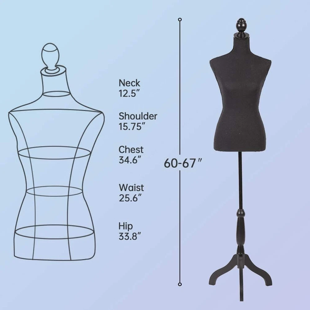 Torso Dress Form Manikin Body With Wooden Tripod Base Stand Adjustable 60-67" ✅ Female Mannequin Torso Dress Form Manikin Body with Wooden Tripod Base Stand Adjustable 60-67 Inch for Sewing Dressmakers Dress Jewelry Display,Black Product Description: This female mannequin torso is designed for dressmakers, sewing enthusiasts, and jewelry display purposes. The adjustable height ranges from 60 to 67 inches, ensuring it fits a variety of needs and display settings. The mannequin is equipped with a sturdy wooden tripod base for stability and features a sleek black color that enhances the presentation of clothing, dresses, or accessories. Perfect for both professional and home use, it offers a stylish yet functional display for your designs or merchandise. Features: Adjustable Height: The mannequin features an adjustable height from 60 to 67 inches, allowing you to customize it for different clothing sizes or display needs. Wooden Tripod Base: The solid wooden base provides excellent stability and a stylish, timeless look while supporting the mannequin securely. Versatile Use: Ideal for sewing, dressmaking, or showcasing jewelry and accessories in a store or studio setting. Sleek Black Color: The black color of the mannequin allows the garments or accessories displayed to stand out, offering a professional aesthetic. Durable Construction: Made from high-quality materials, this mannequin is designed to withstand frequent use and is built to last. Easy Assembly: Quick and simple to assemble, this dress form can be set up in minutes without any hassle. Stylish and Functional: It combines form and function, serving as a practical tool for designers while also doubling as an elegant display piece. Perfect for Home or Professional Use: Whether for a fashion studio, home sewing projects, or retail displays, this mannequin provides an excellent solution for showcasing designs. Chest Size 34.6 Inches Product Dimensions 67"L x 34.6"W x 67"H Material Stainless Steel, Wood Item Weight 4 Pounds Item Length (Description) Mini Color Black Age Range (Description) Adult Waist (cm) 25.6 Inches Size 60-67 Inches Shipping Fast shipping is very important for us. Our standard USA shipping service is FREE. Your order will be shipped within 1-2 business days upon full payment received. Your order will be delivered within 1-3 business days after the handling time. We only ship to the confirmed address. We reserve the right to cancel any order for any reason at any time. We are not responsible for undeliverable addresses. Returns and payment We offer a 30 days return policy from checkout winning date. FeedBack Your feedback very important to us, after you get your package and you are satisfied with our service please leave us positive feedback If you have any problem with your order / any questions please before leave any type of feedback For any questions, using eBay contact system Please visit our eBay store to check out other items for sale! Thank you for shopping at our store.