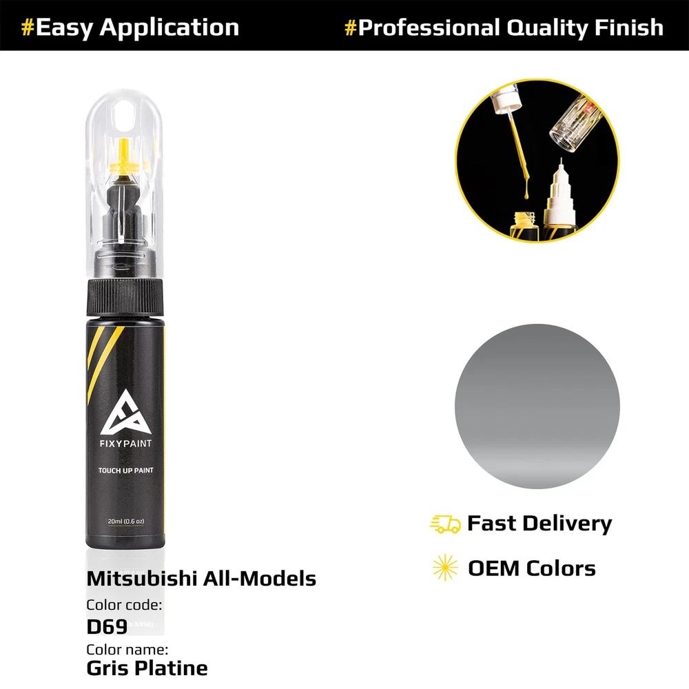 Year: 2020 - 2025 Manufacturer Color Name: Gris Platine Brand: FixyPaint Additional Color Names: Gris Platine Features: Factory Color Match Compatible Make: for Mitsubishi Compatible Model: All Models Type: Touch-Up Paint MPN: "D69; TED69" Country/Region of Manufacture: Germany Additional Color Codes: D69; TED69 Application Type: Brush-on, Paint Pen Application Site: Body Paint Type: Base Coat Volume: 20ml(0.63oz) Manufacturer Paint Code: D69; TED69