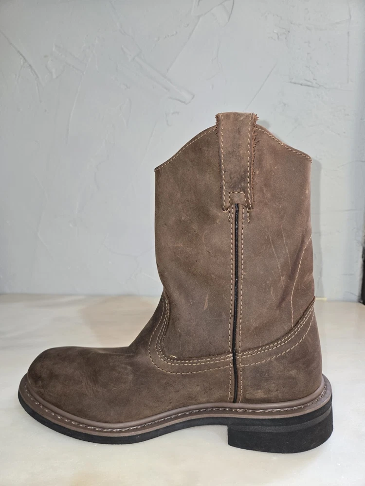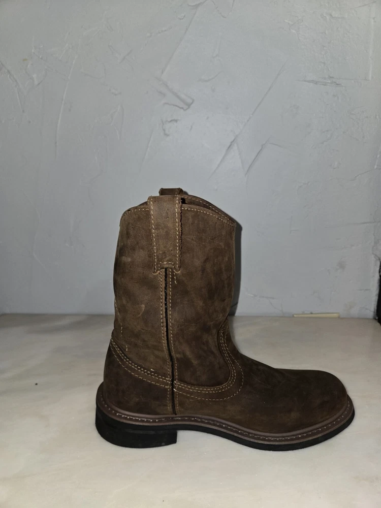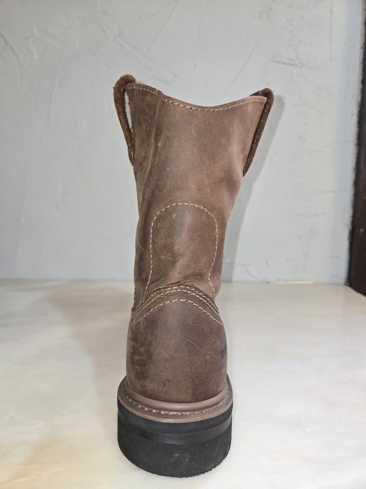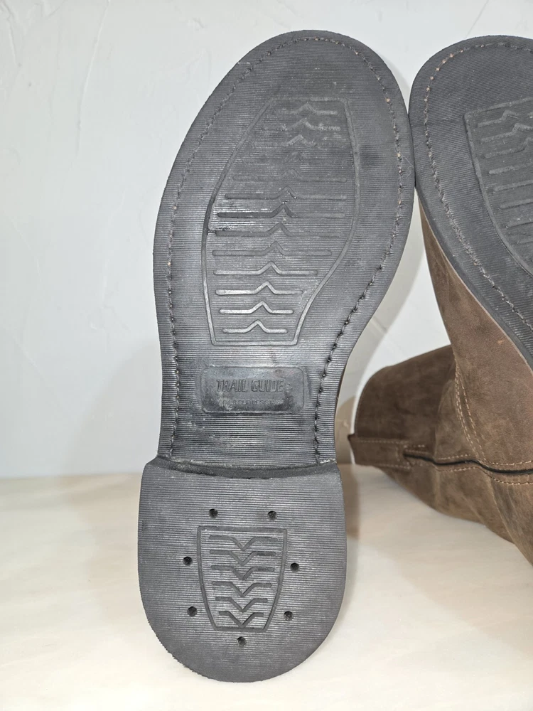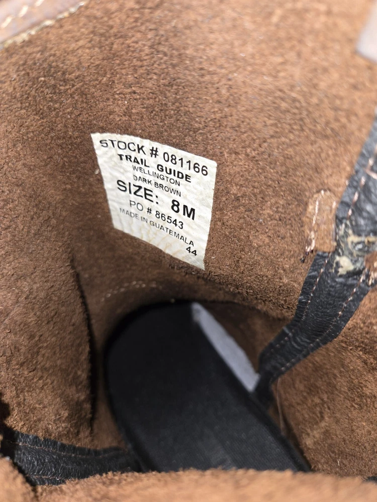 These Trail Guide Wellington leather workwear boots in dark brown with a round toe shape and pull-on closure, they're perfect for casual or workwear occasions. The boots feature pull-on tabs, slip-resistant and oil-resistant properties, making them ideal for winter, fall, and spring seasons. The mid-calf shoe shaft style and solid pattern. The boots are made of leather and have a foam insole material. They're available in men's size 8 and were manufactured in Guatemala. These boots are part of the Trail Guide product line and are perfect for those who love the motorcycle, equestrian, horse, work, or cowboy theme.
