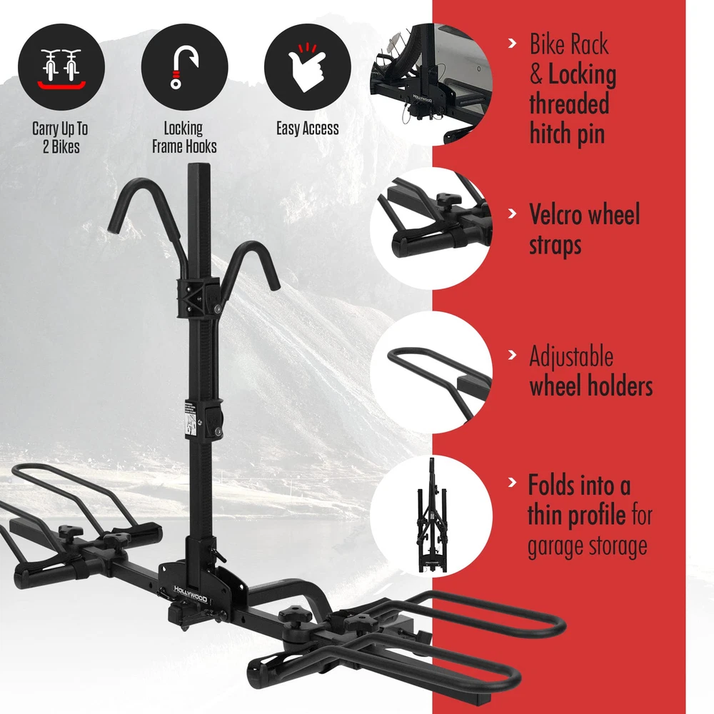 The Trail Rider bike rack system by fits most bikes using a padded universal frame clamp and adjustable wheel holders. Lightweight and ruggedly built, this durable bike rack can carry up to two bikes and offers quick and easy loading. Simply drop the bike into the wheel holders, then slide the locking ratchet frame hook down onto the frame to secure the bike. Includes velcro wheel straps to keep the wheels from spinning while driving. Fits hitch sizes 1.25” and 2”. Not to be used on any trailer, fifth wheel or towed vehicle. Simple, Strong, Secure: Keep your bike safe during transport with the Trail Rider Hitch Mount Bike Rack! This hitch bike rack for 2 bikes is the perfect bicycle rack for a car, and our bike racks are made for convenience and strength. High-Quality and Durable: Crafted with sturdy alloy steel, this bike rack for an SUV or car will keep your bikes safe and secure no matter your destination. Our bike hitch rack has locking bike frame hooks to deter theft with a keyed alike hitch pin. Transport Your Bike: These bicycle car racks are designed to keep up to 2 bikes secure during transport. Our bike mount for a car has a max capacity of 45 lbs per bike and does not support E-Bikes. Kids bikes, ladies' frame bikes, and some mountain bikes may require a top tube adaptor. Always Convenient: With locking hooks to hold frames and protective padding, our bicycle rack hitch carrier works with 1 ¼” and 2” hitches and folds down to access the trunk. Just drop the bike into the adjustable wheel holders and head off! Designed for Simple Storage: With foldable wheel support tubes and folding bike support arms for easy storage in the garage or other part of your home, this bike rack hitch weighs only 34 pounds, so it is convenient whether or not you're traveling!