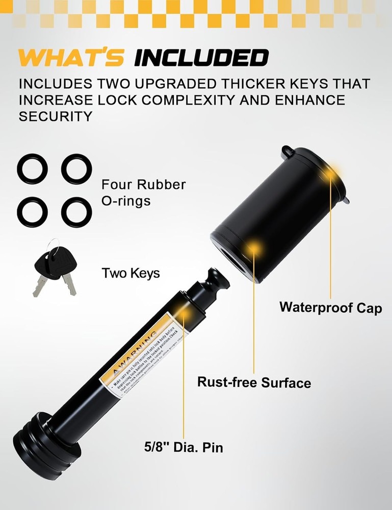 Free eBay listing template designed by dewiso.com RETRUE Trailer Hitch Receiver Pin Lock, Suitable for 2 Inch Receiver, 5/8" Dia Hitch Lock for Securely Locking Trailer Hitch with Two Keys, Black FREE AND FAST SHIPPING! RETRUE Trailer Hitch Lock Design: 5/8 Inch diameter trailer hitch lock pin with Super Extra Long Effective Length 2 3/4 Inch. Specially for big towing vehicle, truck, 2" hitch receiver or Class III IV hitches. Note: For your convenience please verify dimensions and length of pin you need before purchase Durability: The lock cylinder is made of high quality zinc alloy tubular. Its anti-theft design can resist huge impacts from different kinds of external forces. Adapted rubber key slot cap is all-weather proof keeps keyhole safe and clean Easy to Install and Use: This hitch lock keeps your trailer hitch securely locked, giving you peace of mind wherever you go The Fitment of Locking Hitch Pin: Class III IV Hitches, Hitch Bike Rack Tray Ball Tow Rope for Trailer Truck Car Boat What Will You Get: The pin lock covered with high quality solid steel and black electrophoretic paint. It is quite strong and withstand 30,000 lbs, twice as much as a regular pin lock. Come with 4 noise reducing rubber rings. It is from RETRUE Your reliable partner. 24/7 Product We offer a 30-Day Return Policy on items which you are not completely satisfied with. You have the option for a full-refund or an exchange of the item. No returns are available on items shipped outside of the US . Shipping We offer Free Shipping to the US and ship within 2 business days of payment, usually sooner. We use UPS express shipping. That's why your products are usually delivered within 3 days . Contact We try our very best to make sure every customer is completely satisfied. If there's a problem , message us! We're happy to help. 24/7 live chat available.