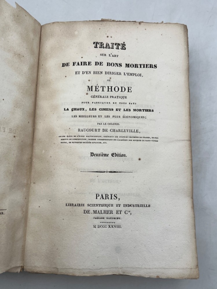 Traité sur l’art de faire de bons mortiers et d’en bien diriger l’emploi, ou Méthode générale pratique pour fabriquer en tous pays la chaux, les cimens et les mortiers les meilleurs et les plus économiques ; Par le Colonel Raucourt de Charleville, Deuxième Édition. Paris. Deuxième édition du Traité sur l’art de faire de bons mortiers de Raucourt de Charleville, publiée en 1828 à Paris chez Malher et Cie. Cet ouvrage technique offre une méthode générale et pratique pour la fabrication de chaux, ciments et mortiers, avec des recommandations pour obtenir des matériaux à la fois durables et économiques. L’auteur, ingénieur polytechnicien et membre distingué de sociétés savantes, met son expertise au service des bâtisseurs et ingénieurs du XIXe siècle, alors en pleine ère de modernisation des techniques de construction. Y11