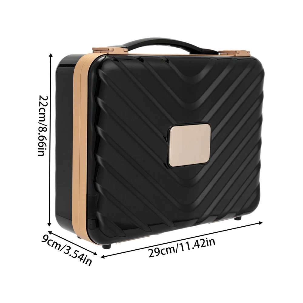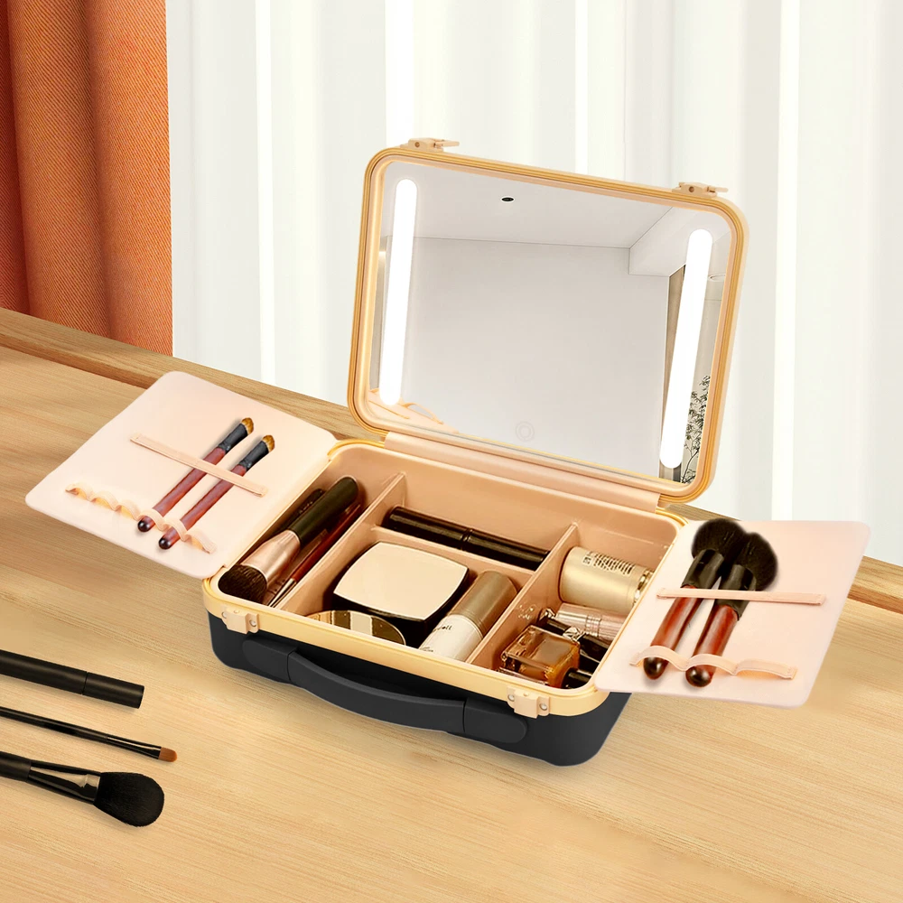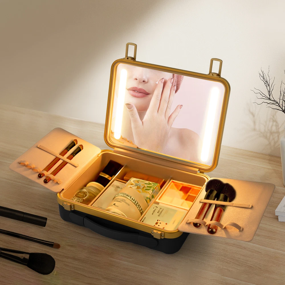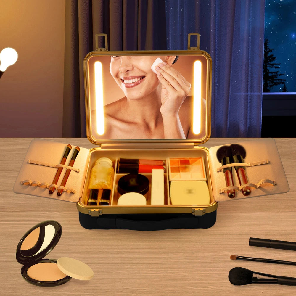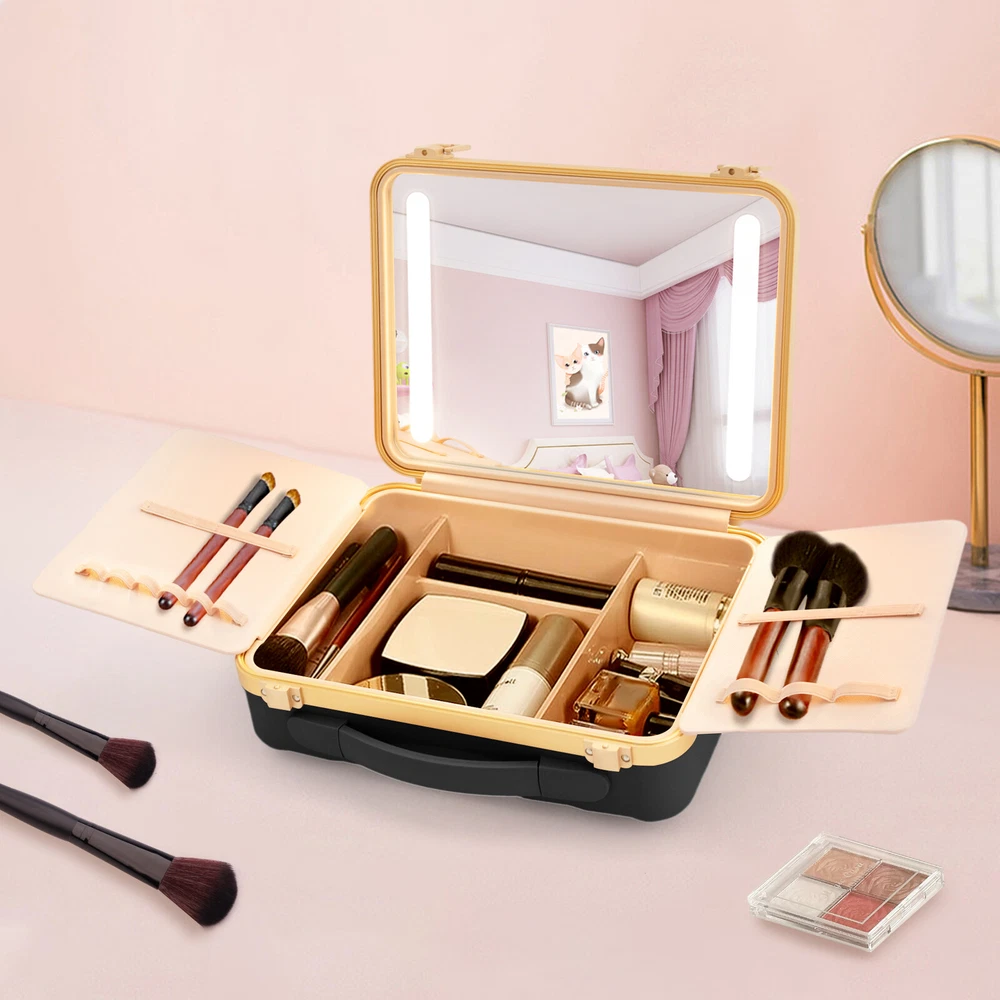 Travel Makeup Bag Case Storage USB Portable Makeup Box with LED Light & Mirror Description Description Whether you're working or traveling, a professional makeup case will be a great convenience. This portable makeup box is made of high-quality material, which is strong and durable. The compartmentalized design makes the items neatly organized, and the clear mirror and LED lights are convenient for you to apply makeup in various environments. It is ideal for professional makeup artists and cosmetologists. Key Features High-quality Material: The product is made of high-quality ABS, aluminum alloy, and silicone with the injection molding process, which is strong, pressure-resistant, waterproof, impact-resistant, corrosion-resistant, rust-resistant , and has a long service life. Categorized Storage: Four compartments inside have large storage space to categorize and organize your various cosmetics, and two baffles with elastic bands can store and secure makeup brushes, as well as prevent cosmetics from coming into contact with the mirror. Humanized Design: There is a large 4K silver-plated mirror with LED light inside the product, and the light colour can be easily adjusted/infinitely adjusted between warm light, neutral light and white light by touching/long-pressing the switch, which can help you see more details of your makeup and restore the true state of your makeup. Long Endurance: With a built-in 5000mAh rechargeable lithium battery, it can be illuminated for 4-6h after being full charged. Equipped with a USB charging cable, you can charge the product via mobile power, laptop, or adapter(not included), which is very convenient for both home and travel. Ideal Gift: With a stylish appearance and practical functions, this product is an ideal birthday and holiday gift for family, friends, fashionistas, and beauty lovers. Ready to Use: This product does not require assembly, and you can start using it once you receive it, saving the tedious installation process and making it more convenient. Effortless Cleaning: Thanks to the smooth surface and simple structure, you can easily wipe off the dirt on it with a soft cloth. Protective Packaging: The sponge can better protect your product during transportation and make it delivered to you completely to the greatest extent. Good Customer Service: We stand behind all our guests and look forward to assisting you with your purchase. It is our pleasure to answer your confusion and questions. The end of the story between us is not "we sell and you buy". Details Comfortable Handle: The silicone handle is comfortable to grip and easy to carry so that you can always keep your delicate makeup even when you are traveling. Solid Base: With 4 silicone feet on the back of the case, it can hold the product in place so that it is not easy to slide. Stable Hinges: The robust hinge makes it easy to open (up to 180°) and close without being damaged. Rounded Corners : The corners and smooth edges are designed to provide a comfortable and safer touch. Application This product is suitable for travel and home makeup use or as a jewelry case, ideal for makeup artists, hair stylists, nail technicians, and cosmetologists. Specification Color: Black Style: Modern Shape: Rectangle Material: ABS, Aluminum Alloy, Silicone Process: Injection Molding Assembly Required: No Opening Method: Buckle Power Source: Battery Powered, USB Light Source: LED Light Color: Warm, Neutral, White Battery Type: 1*5000 mAh Lithium Battery ( Included ) Charging Time: About 1-2h Endurance Time: 4-6h Maximum Opening: 180° Gross Weight: 2kg/ 4.41 lbs Net Weight: 1.6kg/ 3.53 lbs Package Size: 33*14*29 cm/ 12.99*5.51*11.42in Product Size: 29*9*22 cm/ 11.42*3.54*8.66 in Package Included 1* Portable Makeup Box 1* Chinese and English Manual 1* USB Charging Cable Notes Please note that cosmetics and make-up tools are not included. Please read the operating manual completely before use. And pay particular attention to the safety instructions included. Please allow the slight color difference caused by the shooting light and the 1-3 cm error due to manual measurement, and make sure you do not mind before ordering. Payment Delivery details Terms of sales About us Contact us Payment We accept ebay payment 。 Fees such as import duties, taxes are not included in the item price or shipping costs. These charges are the buyer's responsibility. Delivery details Shipping: 2-9 working days to: USA Terms of sales We maintain high standards of excellence and strive for hundred percent customer satisfaction. Feedback is very important to us. We hope that you contact us immediately before you give neutral or negative feedback, so that we can address your concerns. It is impossible to address issues if we do not know about them! About us Your satis faction is our ultimate goal. We work hard to earn your trust and future business. Our certified technicians have tested each item before shipping. The unit comes with 1 year limited warranty on all manufacturing defects. a) If you receive a defective item, you may return it or ask for a discount. Please contact us within 14 days after you receive the package. b) What you returned must be intact and in its original packaging as re? u. Customer is responsible for shipping costs of the returned item. c) We will cover the cost of shipping back t with the shipping rate indicated in the registration page. We will send you a new unit or refund the full payment you paid. Thank you. Contact us Business Hour Business Hour: Monday To Friday: 8:30 AM to 5:00 PM (Beijing China time) Due to time zones, our reply to your questions may not be immediately. But within above working time, we will reply your email within 24 hours. If it's non-workdays, please kindly be patient and wait till Monday. Please contact us with ebay message. Please feel free to contact us if you have any questions. Monday To Friday: 8:30 AM to 5:00 PM (Beijing China time) Due to time zones, our reply to your questi