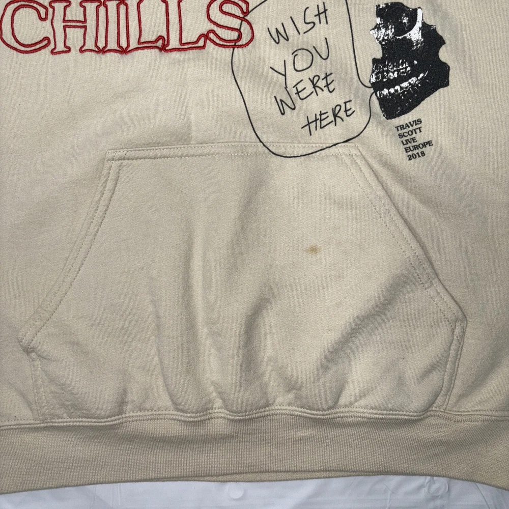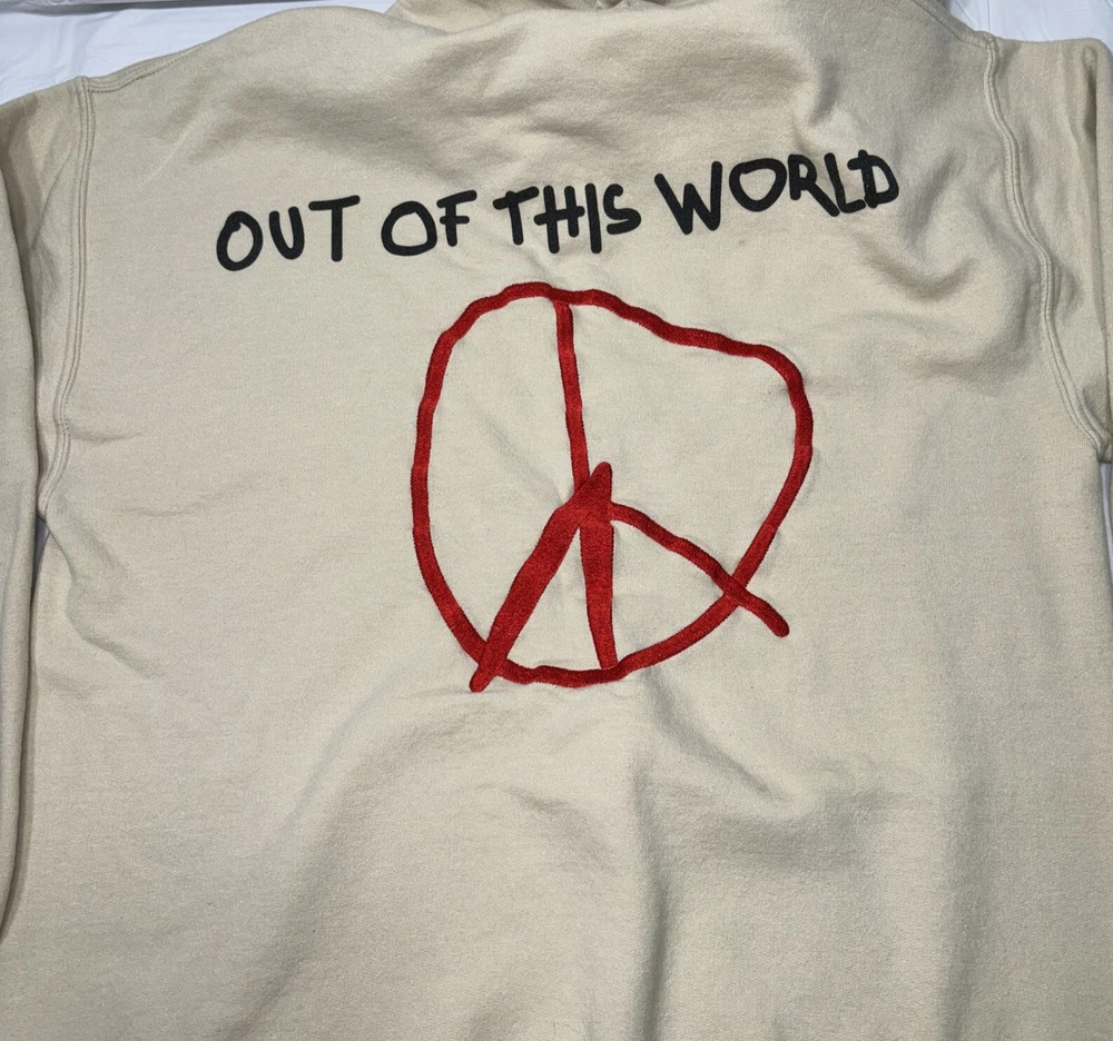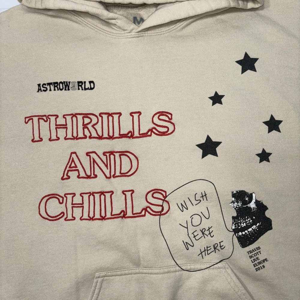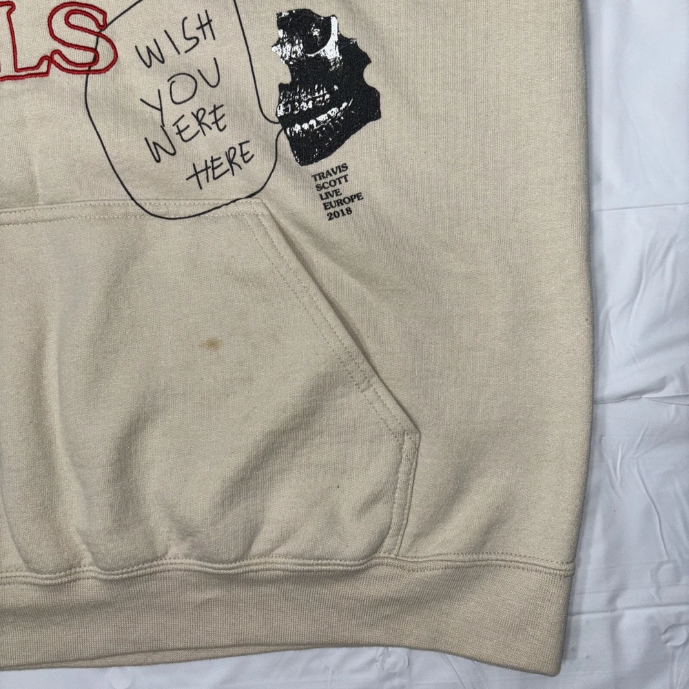 The hoodie is a size M and is perfect for men who want to show off their love for Travis Scott. It is ideal for casual wear and is sure to turn heads wherever you go. So, if you want to stay warm and stylish while showing off your love for one of the most popular rappers in the world, this hoodie is the perfect choice. The hoodie is used comes in size M ..we tried to put everything in the picture so everything can be visible ..they are some small marks and spot but still the hoodie is in good condition to any fan or collector …and very warm also ☺️ Please before purchase feel free to reach out to us for any questions or to post more pictures 🙂
