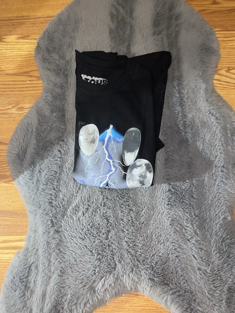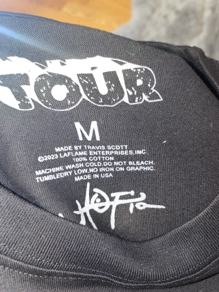 The Travis Scott Flower Merch T-Shirt by LaFlame features a black cotton fabric with a graphic flower print. It has short sleeves, a regular fit, and is a limited edition item. The size is medium for men, making it a stylish and unique addition to any wardrobe.