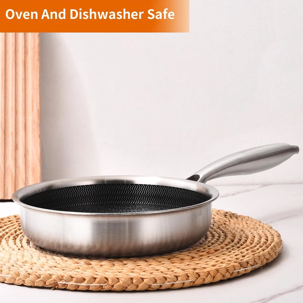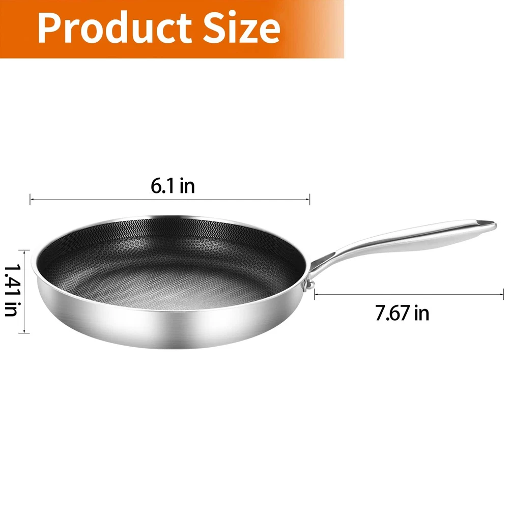 Whole body Tri-Ply Stainless Steel 6inch Hybrid Frying Pan 【HEALTHY MATERIAL】The Small Frying Pan Is Made of Triply Stainless Steel. The 6 inch Small Egg Frying Pan is Corrosion-Proof, and Won't Interact With Food, Thus Ensuring Healthy Cooking. Oven Safe to 600℉ 【Non-Stick Coverting】Our 6" Frying Pan are BPA-Free, Lead & Cadmium-Free, And Heat Resistant For Long-Lasting Excellent Cooking Results And Great Convenience for The Cooking and Cleaning Process 【Fast & Even Heating】The Entire Mini Egg Pan Is All Tri-Ply Bonded Construction Ensures Optimal Heat Distribution For Fast Even Heating, and Energy Saving, Will Spend 20% Gas Or Electricity Less That You Have Spend in Cooking Before 【Suitable For All Stoves】The Egg Skillet Works On All Stove Tops, Including Induction, Gas, Electric, Halogen, Glass, And Ceramic. The High-Quality Stainless Steel And The Aluminum Core Make It Dishwasher-Safe And Oven-Safe Up To 600°F