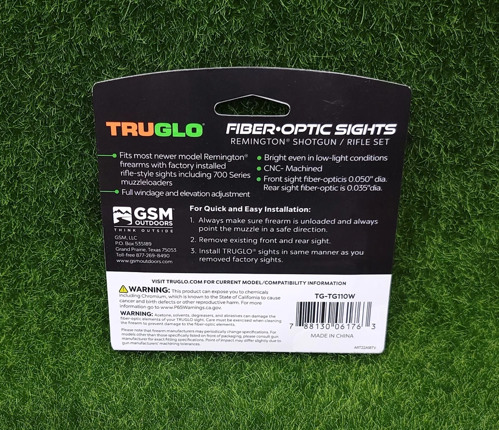 TruGlo Remington Shotgun/Rifle Fiber Optic Sight Set, Green/Red - TG110W PRODUCT DESCRIPTION TruGlo TG110W : TruGlo's Remington Shotgun/Rifle Set sights first most newer Remington firearms with factory installed rifle-style sights including 700 series muzzleloaders. Its frame is CNC-machined steel and includes front/rear fiber holders. Fits most newer model Remington® iron sight models, including 700 Series muzzleloaders Full windage and elevation adjustment Includes front and rear fiber holders CNC-machined steel construction Front diameter is .050" Rear diameter is .035" Excludes newer 700 / 7500 / 760 models with one-piece front sight design. Excludes Takedown® model.