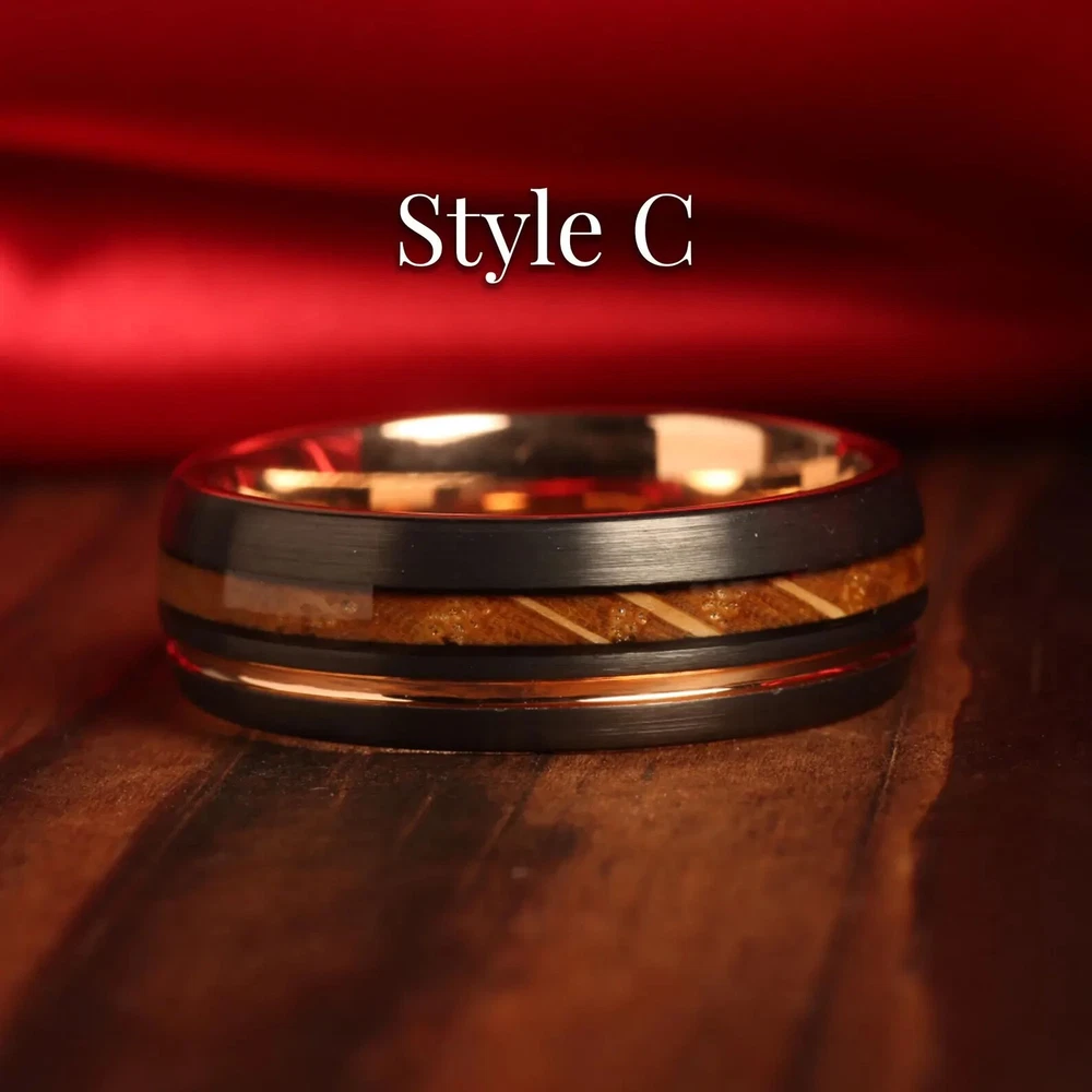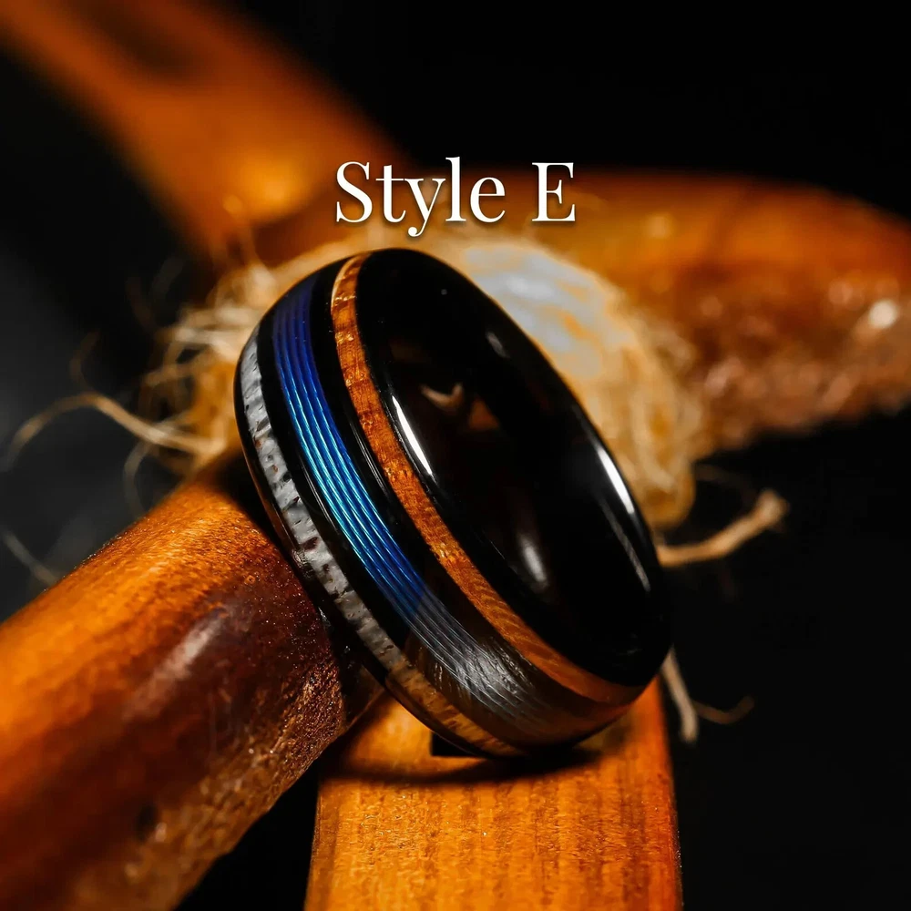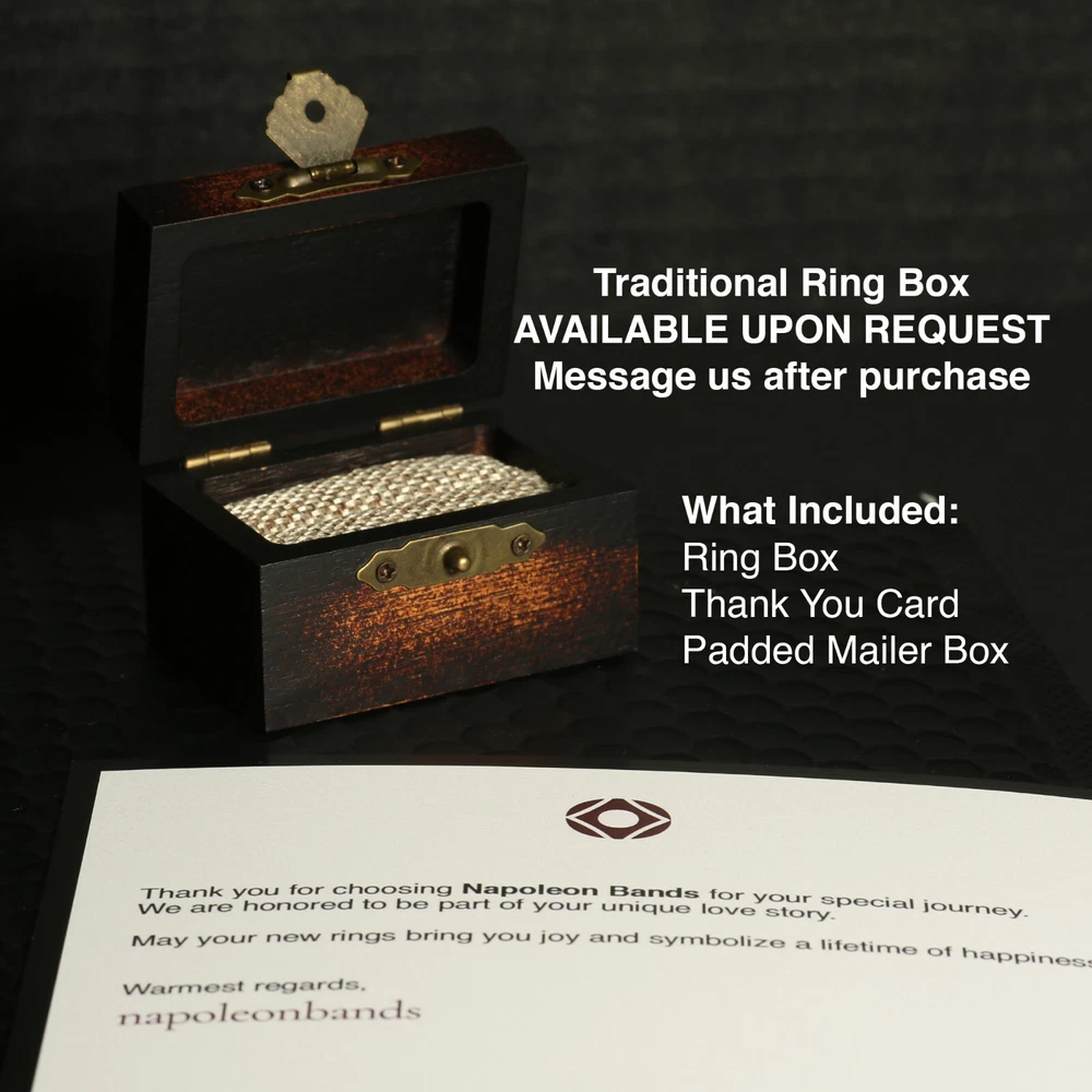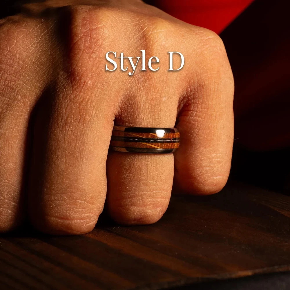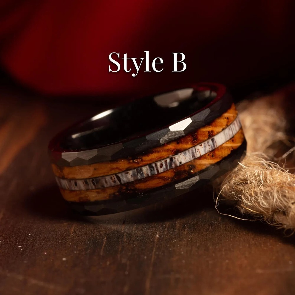 Whiskey Barrel Men’s Ring – 8mm Tungsten Wedding Band with Deer Antler, Guitar String & Aged Oak Wood Inlay | Handmade by NapoleonBands A Story Worth Wearing – Rustic, Refined, and 100% Unique This isn’t just a ring—it’s a legacy. Our Whiskey Barrel Collection transforms reclaimed oak wood from aged whiskey barrels into a bold, masculine 8mm tungsten wedding band that tells a story as rich as the spirit it once held. Paired with natural deer antler and guitar string inlays , this ring is for the man who values craftsmanship, meaning, and individuality. To complete the experience, each Napoleonbands ring is elegantly presented in a premium, artisan-crafted wooden box , complete with personalized laser engraving : https://www.ebay.com/itm/405600082986 For those seeking an elevated presentation, you can upgrade upon request to our luxurious, handcrafted koa wooden ring box — a true statement of craftsmanship and distinction: https://www.ebay.com/itm/405948705902 Ring Details: Material: Genuine Tungsten Carbide Inlays: Whiskey Barrel Oak, Deer Antler, Guitar String Band Width: 8mm Fit: Comfort-Fit (True to Size) Finish: Polished Tungsten with Rustic Accents Protection: Sealed with Ring Armor Resin – water & dirt resistant Customization Available: Add a personal engraving Shipping: We offer free shipping within the U.S. Returns: If your ring is not engraved, you’re welcome to return or exchange it—just reach out to us. If your ring is engraved, we’re unable to accept returns. However, if there’s an error on our part with the engraving, we’ll make it right. Why You'll Love It: ✔ Made from reclaimed whiskey barrel oak – no two rings are alike ✔ Durable, scratch-resistant, and built for 24/7 wear ✔ Safe for sensitive skin – hypoallergenic materials ✔ Free ring sizer available after purchase ✔ Comes with a handcrafted antique wooden ring box ✔ Lifetime warranty + 30-day exchange/return policy ✔ Ships fast and free within the U.S. The Craft Behind the Ring: Each ring starts its journey in a white oak tree, aged through years of whiskey storage. Once retired, the barrels are reclaimed and hand-finished into striking ring inlays. The natural deer antler and guitar string add a rugged edge, blending nature and music into a statement of strength, creativity, and passion. Perfect For: Grooms who love whiskey, nature, or music Anniversary gifts with character Rustic weddings or everyday wear Limited Quantities Available Due to high demand and the unique sourcing of our materials, this ring may sell out quickly. Secure your size while it’s still available.