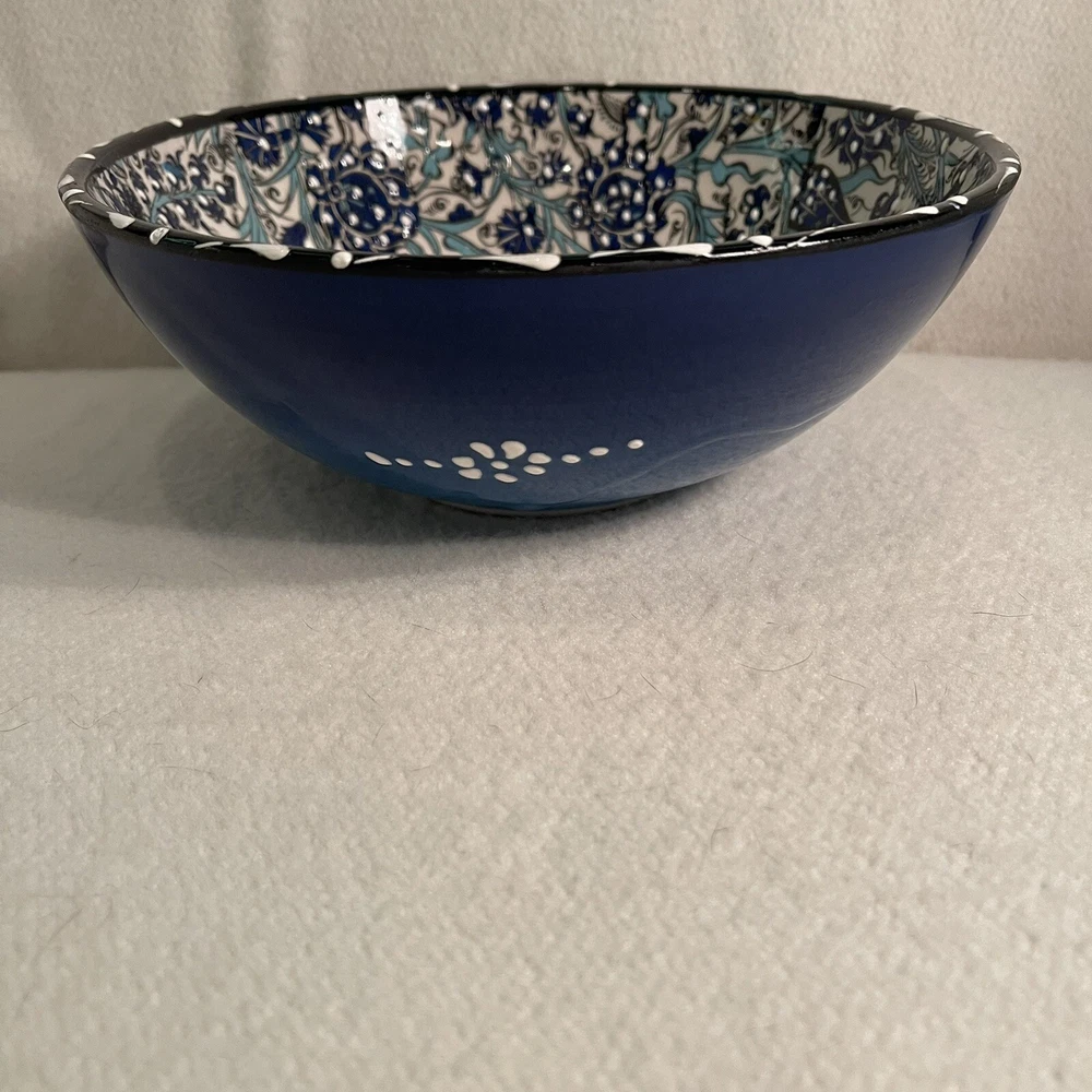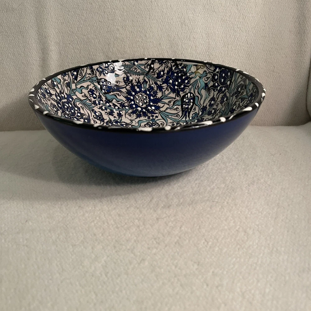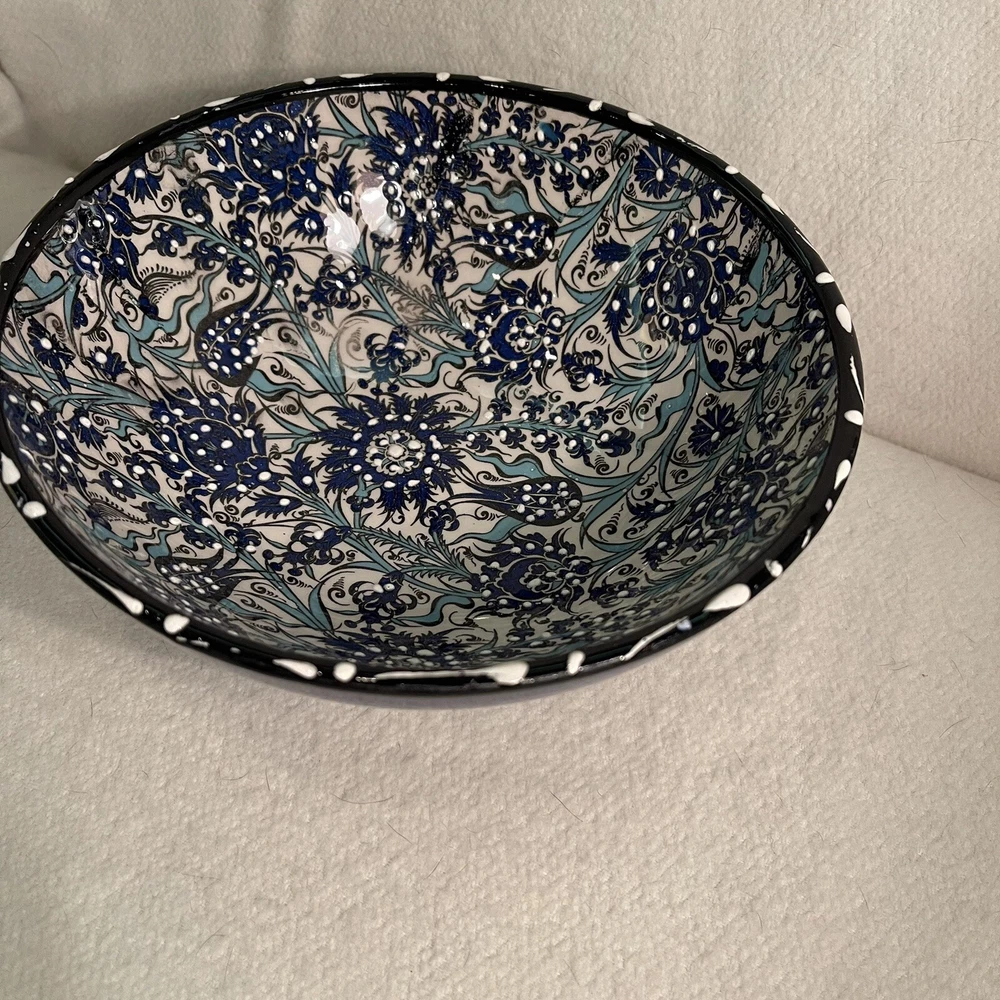 This Turkish ceramic serving bowl features a hand-painted floral motif in blue, white, and black colors. The round bowl has a diameter of 8.25 inches and a height of 3 inches, making it a decorative and functional piece for serving food. With a vintage style and contemporary design, this art pottery piece from the 1990s is a unique addition to any table setting, showcasing traditional Turkish craftsmanship and a floral theme. The brand is Turkish, and the bowl is made of ceramic, weighing 1.5 lbs. Excellent condition. No chips or cracks.