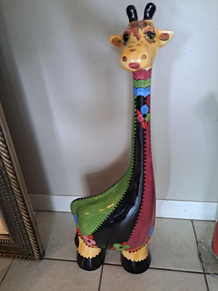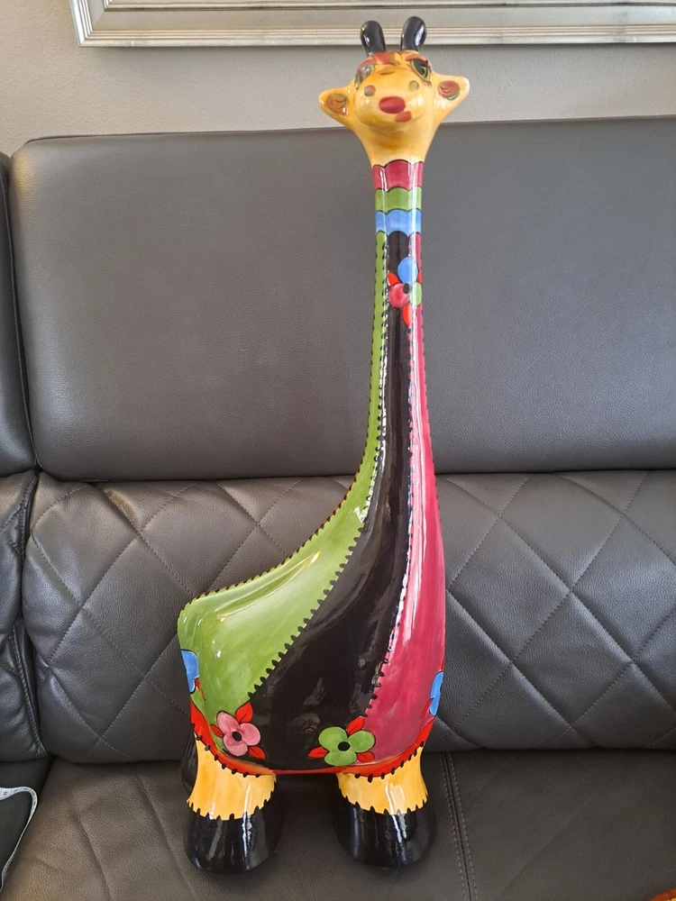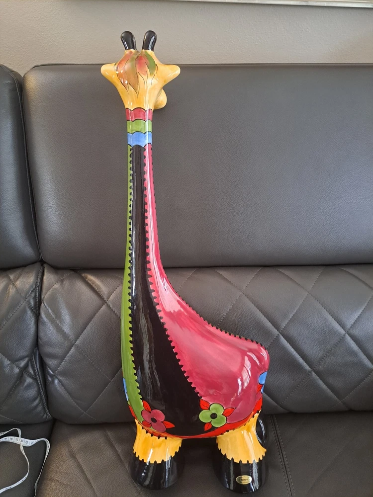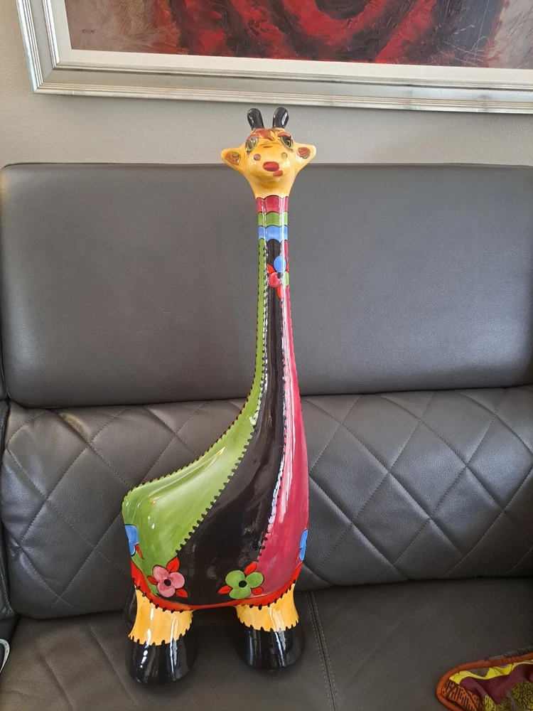 Add a touch of contemporary style to any room with this beautiful Turov Art Ceramics handpainted giraffe figurine. The large, glossy finish and multicolor all-over pattern make it a perfect addition to any decor. This figurine is a limited edition, signed by the artist and manufactured in the late 20th century in the United States. The giraffe subject, represented in a sticker label model, is perfect for all occasions and suitable for any table. It is easy to care for and does not require any additional parts. This original piece is perfect for collectors and art enthusiasts alike. 27 inches height 12 inches width