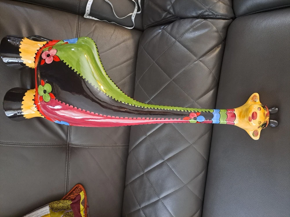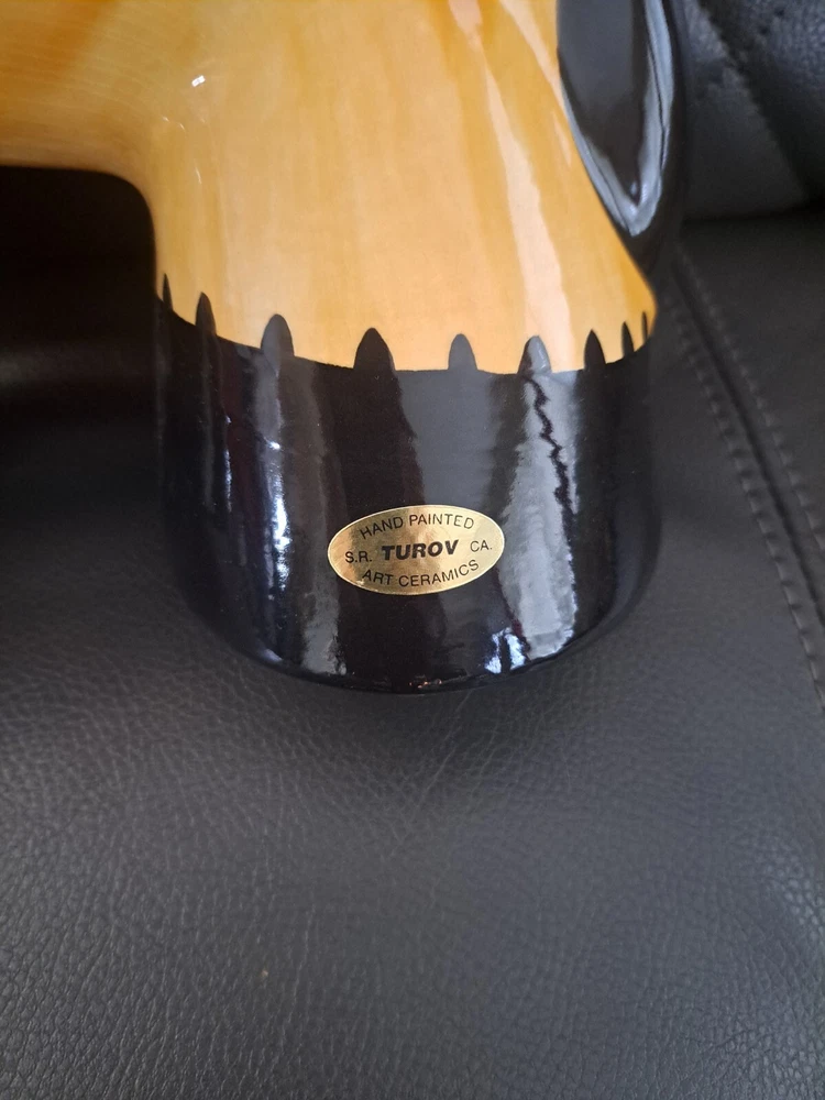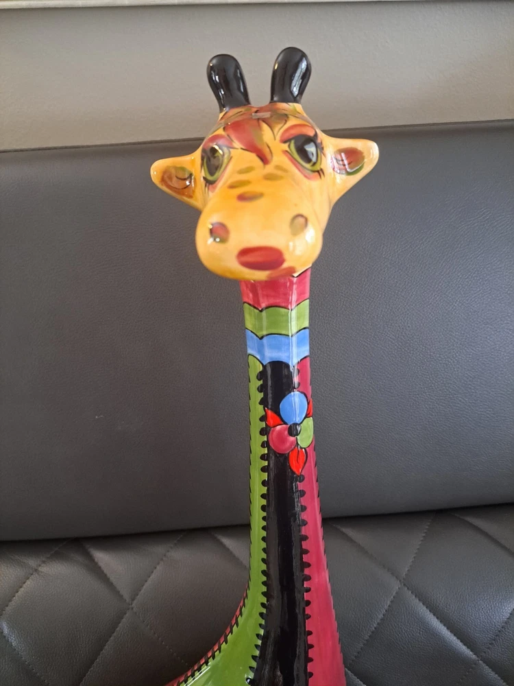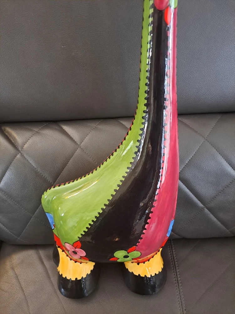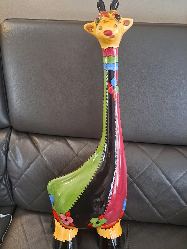 Add a touch of contemporary style to any room with this beautiful Turov Art Ceramics handpainted giraffe figurine. The large, glossy finish and multicolor all-over pattern make it a perfect addition to any decor. This figurine is a limited edition, signed by the artist and manufactured in the late 20th century in the United States. The giraffe subject, represented in a sticker label model, is perfect for all occasions and suitable for any table. It is easy to care for and does not require any additional parts. This original piece is perfect for collectors and art enthusiasts alike. 27 inches height 12 inches width