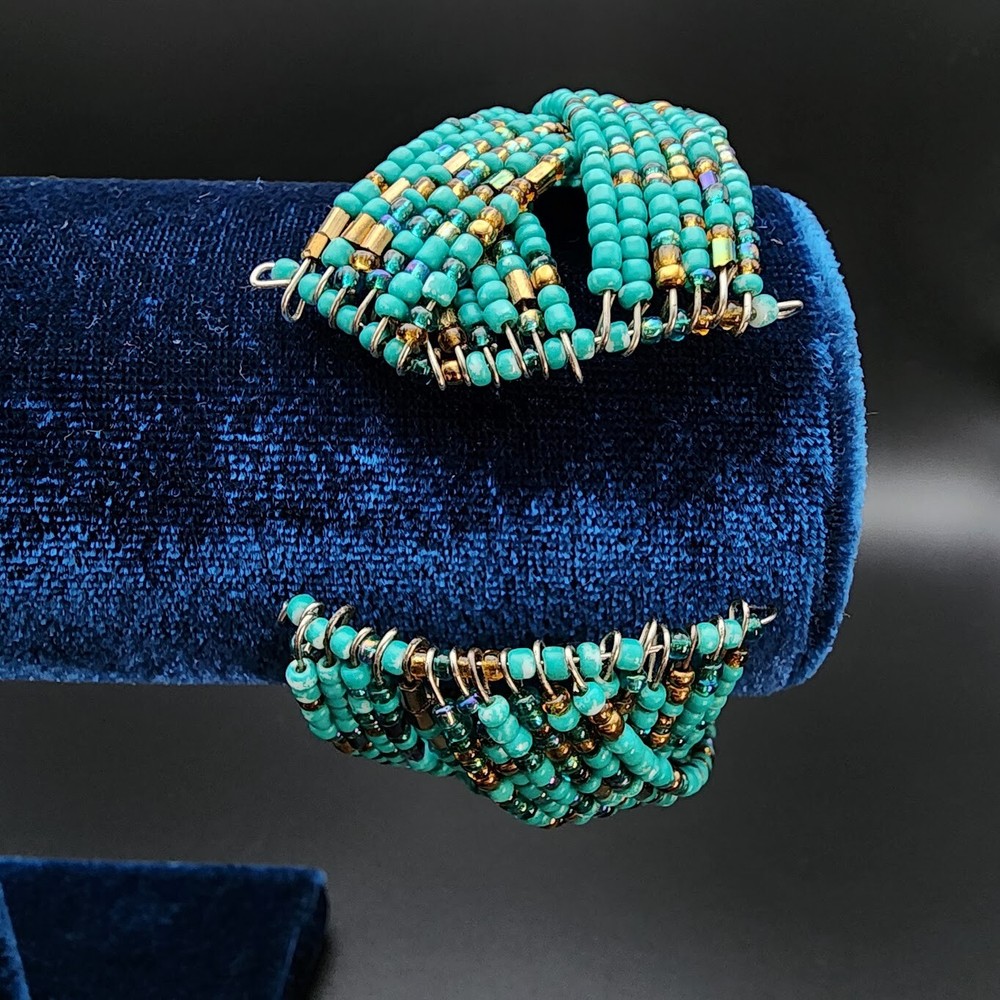 Chain Type:WireBrand:HandmadeSecondary Stone:No StoneSetting Style:.Main Stone Treatment:UnknownTheme:Beach, Beaded, BohemianMain Stone Creation:UnknownSeller Notes:“Great Condition. See pics for details.”Main Stone:Not ApplicableItem Length:7.5 inHandmade:YesCountry/Region of Manufacture:UnknownMain Stone Color:BronzeMetal:UnknownCountry of Origin:UnknownNumber of Gemstones:0Charm Type:BeadCut Grade:.Modified Item:NoType:BraceletClosure:.Style:Beaded, CuffColor:TurquoiseVintage:YesClasp Type:CuffMaterial:Glass Beads