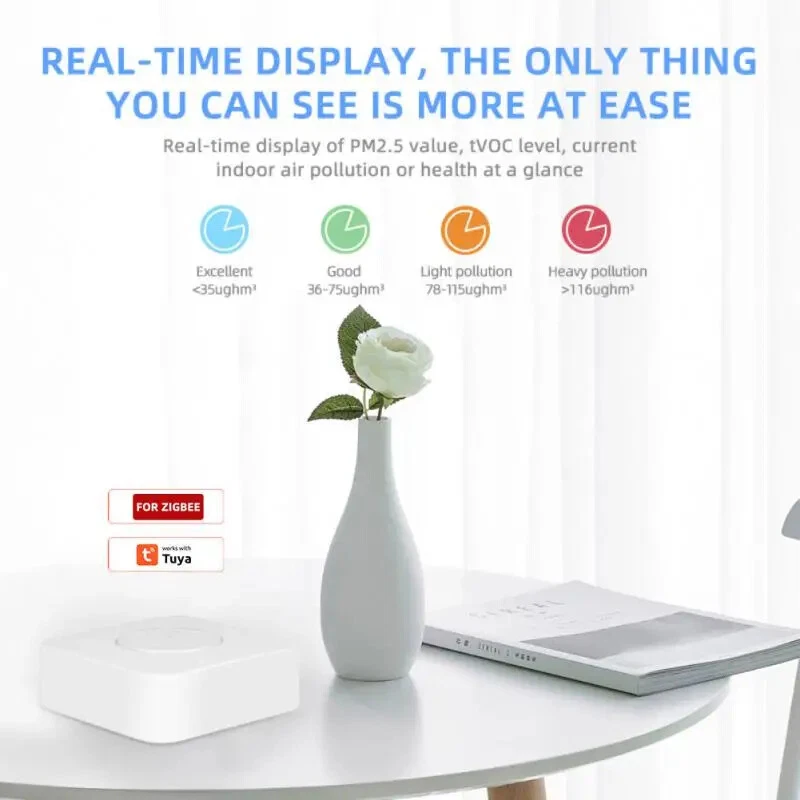 Tuya CO2 Carbon Dioxide Sensor VOC Detector NDIR High-precision Measurement Exceeds Standard Alarm Smart Home Linkage Tuya Senso Description: Working temperature: -20--85℃ Working voltage (rated): 4.8-12V Working current: 10-496ma Size: 90*90*35mm Power supply mode: USB 5V/1A Communication protocol: WIFI 2.4GHZ color: White Shell material: PVC Examination range: Formaldehyde: 0-10.0 (mg/m3) VOC: 0-99.9 (ppm) Carbon dioxide: 0-1000 (ppm) Temperature: 0-60 (℃) Humidity: 0-95 (%) After being paired to the APP, it can be linked with various smart home products. For example, when detecting excessive formaldehyde/VOC, the smart air purifier is automatically turned on; when the carbon dioxide is exceeded, the smart fresh air fan is automatically turned on; when the temperature is abnormal, the air conditioner temperature is automatically adjusted ; When the humidity is too low or too high, the smart humidifier will be turned on/off automatically; when a certain parameter is detected to exceed the standard, a message will be sent to the alarm (the above smart linkage function needs to be matched with the smart home product) 100% Brand New and High Quality! Smart air box is the home of intelligent device for remote monitoring of air environment,It can also detect formaldehyde, VOC of poisonous gas, CO2, temperature, humidity and so on 5 kinds of environmental parameters,In environmental parameters exceed bid automatically when the graffiti smart home air conditioning, new fan, humidifier, air purifier on household environment optimization. The detection range of the smart air box: formaldehyde, VOC gas, CO2, temperature, humidity Specifications: 1. 100% Brand New and High Quality:The product is 100% brand new and of high quality. 2. Smart air box:It is a smart air box that serves as the home for an intelligent device for remote monitoring of the air environment. 3. The detection range of the smart air box::The detection range of the smart air box covers formaldehyde, VOC gases, CO2, temperature, and humidity. 4. Optimizing the home environment:When the environmental parameters exceed certain levels, the graffiti smart home air conditioning, new fan, humidifier, and air purifier automatically adjust to optimize the household environment. 5. Improving the quality of living environment:The smart air box is a reliable and convenient solution for improving indoor air quality and creating a healthier living environment. Package Included: smart air box X1 Instruction for use X1 Card pin X1 USB power supply cord X1 Notes: please do not put air box at lampblack is too big, strong convection air or in high concentration organic gas for a long time, otherwise it will damage the sensor.
