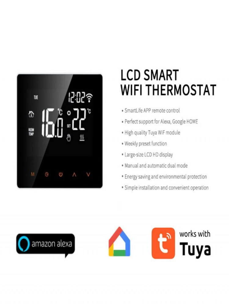 Description: [ LCD Touch Display ] - Elegant appearance, one face design, anti-scratch. Large LCD touch screen display with back light, easy to read. [ APP /Voice Control ] - Smart thermostat that can be controlled by your phone before you come back home. (APP: Tuya / Smart life. voice control by Goolge home alexa) [ Manual/ Auto Mode] - Free to choose manual mode or auto mode for different purposes. [ Accurate Temperature ] - Internal sensor floor sensor, perceptive ambient temperature and the floor's temperature. Automatically obtain the temperature, 1°C accuracy. [ Weekly Programmable ] - The thermostat supports different temperature setting accordingly with 6 time-modes daily. [ Memory Function ] - No need to worry about power failure, data memory when power is off. [ Children Lock ] - Keypad locking function is designed to prevent children from operating by mistake. [ Application ] - Suitable for electric heating/water gas boiler/water heating.Perfect for home, office, shopping mall, hotel, etc. Specifications: -- Type: Wi-Fi smart thermostat -- Material:anti-flammable PC -- Voltage:110-230V AC,50/60HZ -- Max. Current Load: 16A/3A -- Temperature Accuracy: 1℃ -- Temperature Setting: 5-95℃ -- Key: Touch Key -- Item Size: 86 * 86 * 40mm / 3.4 * 3.4 * 1.6in Package Included: 1*EU Toucn Switch 1*User Manual