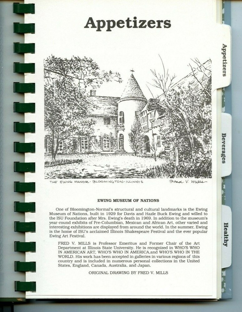 Includes index, calorie counter, tips and other helpful information, and cooking terms. Plastic spiral-bound cookbook, " A Taste of the Twin Cities... Appetizers ." Illustrated with drawings by Fred V. Mills, a former professor of art at Illinois State University . Gift inscription signed by the illustrator on the Table of Contents page. P ublished by St. Joseph Auxiliary of Bloomington and Normal, Illinois in McLean County IL . The first cookbook in the series of "A Taste of the Twin Cities." Dark green plastic spiral-bound hardcover book of recipes. Illustrated front cover and black lettering. Section dividers are illustrated with drawings of Bloomington landmarks . Recipes for appetizers, beverages, healthy appetizers, quick to prepare, and snacks for kids . Name of the contributor is listed with the recipe. Copyright 1996. Published by Cookbooks by Morris Press. If you collect cookbooks or items of regional interest, take advantage of this opportunity to add this book to your collection. Check my listings of other cookbooks and local history items. I combine shipping! Buyer pays shipping. Buyer must pay within three business days unless other arrangements are made with the seller. Money will be refunded if you are not satisfied with your purchase. Will combine shipping if buyer makes multiple purchases from my listings.