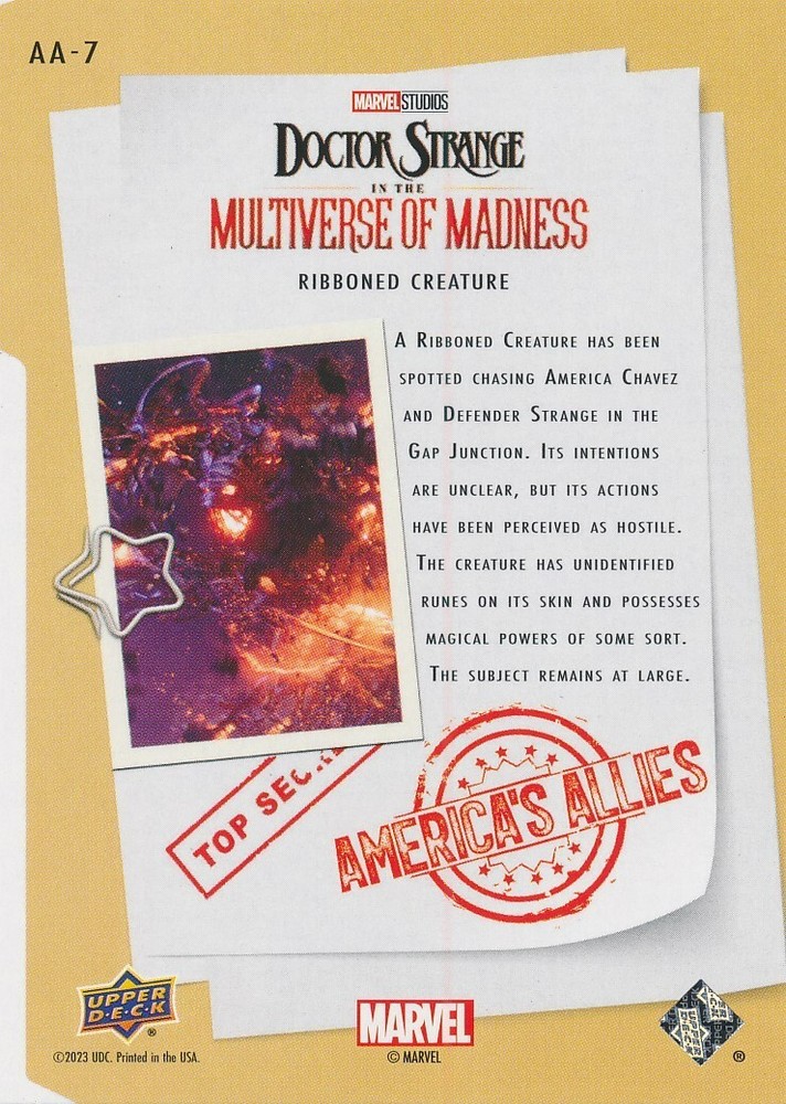 This listing is for the 2023 Upper Deck Marvel Doctor Strange Multiverse of Madness AMERICA'S ALLIES card in the picture and title. ALL TRADING CARDS UNDER $20 CAN BE SHIPPED IN A PAPERBOARD MAILER FOR .91 cents OR YOU CAN CHOOSE A BUBBLE MAILER FOR A FLAT RATE SHIPPING FEE OF $3.00 WITHIN THE US. No additional shipping is charged in the United States, no matter how many more cards you buy in the same order. If you are planning on bidding on more then one item please wait for a final invoice after all of the auctions you are interested in are done. Shipping Internationally is available. Please use the Shipping calculator provided under the Shipping tab to find out the rates. If you have any questions, please let me know.
