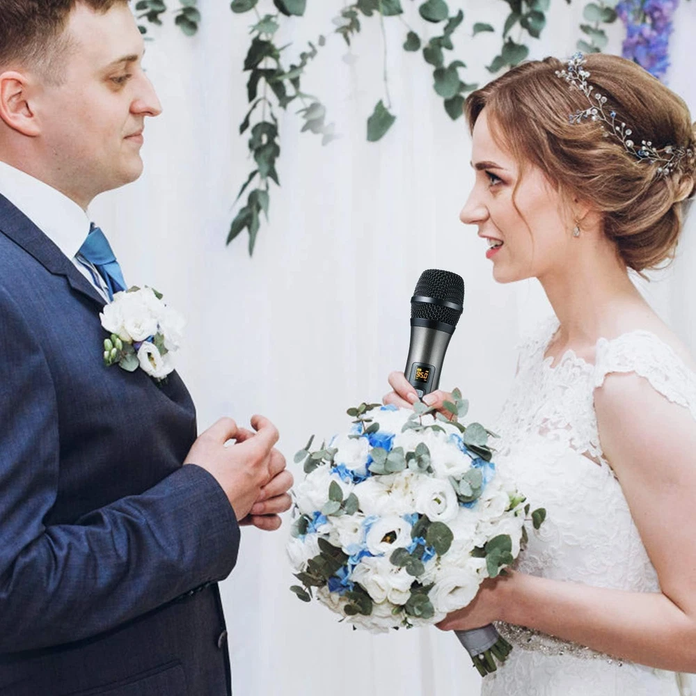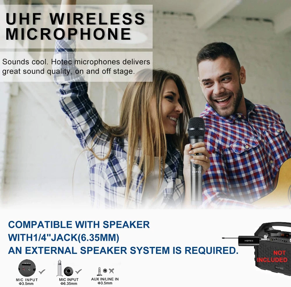 Store New Arrivals Add to Favorite View Feedback Contact UHF Wireless Dual Handheld Microphones with Rechargeable 1/4” Output Mini Portable Receiver for Live Performance over PA, Mixer, Speaker (H-U26C) Description Hardware Platform Audio mixer, PA system, Karaoke Machine Frequency Range 902 - 928 MHz Signal-to-Noise Ratio 70 dB Power Source Battery Powered Color Dual Black Included Components function(f) {var _np=(window.P._namespace("DetailPageProductOverviewTemplatesJava"));if(_np.guardFatal){_np.guardFatal(f)(_np);}else{f(_np);}}(function(P) { P.when('A').execute(function(A){ A.on('a:truncate:po-attribute-truncate-7:updated', function(data) { var isTruncated = !data.truncateInstance.getIfTextFits(); var seeMoreElement = document.getElementById('po-attribute-see-more-id-7'); if(seeMoreElement) { seeMoreElement.style.display = isTruncated ? '' : 'none'; } }) }); })); Two Handheld microphone and a Mini wireless receiver(included a large capacity battery), 4 AA batteries and a USB charging cable, Two Microphone foams and two Anti-rolling protection rings See more Compatible Devices Camera, Speaker Model Number H U26C Connector Type 6.35 mm Jack Connectivity Technology Wireless Number of Channels 32 Recommended Uses For Product Singing, Karaoke Microphone Form Factor Handheld Number of Batteries 1 Lithium Ion batteries required. (included) Polar Pattern Unidirectional Special Feature Mute Function Special Features Mute Function FULL COMPATIBILITY: Widely compatible with karaoke machines, PA, mixer, speaker that has 1/4” mic input for voice amplifying by plugging the mini receiver into these audio devices. STAGE SOUND QUALITY: High quality sound transmission, clear voice and without feedback, free from distortion. Transmission range can be up to 100 feet in open areas at line of sight, free from obstacles between microphone and receiver. LONG WORKING TIME: Plug and play. AA battery powered microphone and large capacity rechargeable battery in the mini receiver allows up to 10 hours working time. SUPPORTS MULTIPLE SETS WORKING TOGETHER: The UHF technology in this handheld microphone allows you to use maximum 32 sets together without interference with each other when each set is working on a different frequency. MULTI-USE APPLICATIONS: Perfect choice for karaoke party, DJ, wedding, church, business meetings, classroom activities, outdoor or onstage performances. OPTIONAL USAGE: You can also use this to record audio with both Andriod and iOS phones or DSLR cameras using appropriate adapters (sold separately). WHAT YOU GET: One receiver and two handheld microphones (one CHA and one CHB), two mic windscreens, two anti-rolling rings, one large capacity battery for the receiver and 4 AA batteries for the mic, one charging cable. Product Description UHF Wireless Handheld microphone Perfect for vocal transmission or recording for both beginners or professionals.This Hotec professional UHF dynamic Wireless Microphone System provides clear vocal sound. This wireless microphone system works best with any PA, loud speaker, mixer, amplifier or home theater system that has ¼” mic socket. Perfect choice for karaoke party, DJ, wedding host, church, business meetings, public speaking, classroom activities, outdoor or onstage performances. This H-U26C model is a dual wireless microphone, one portable mini receiver works with two microphones. The UHF technology allows you to use several sets simultaneously. You will get: H-U26C Handheld microphone x 2 / H-U26C Mini wireless receiver x 1 / Microphone foam x 2 / Microphone anti-rolling protection ring x 2 / USB charging cable x 1 Crystal clear vocal sound These professional wireless dynamic handheld microphones offer a great frequency response with a cardiod pickup pattern to isolate the primary sound source and minimize background noise, it offers pristine vocal sound. Plug and Play Plug the mini receiver into the mic socket of any powered speaker, mixer, amplifier for audio output, power on the mini receiver and microphone, it is ready to go. Supports multi sets working togethher This UHF wireless microphone system has 32 frequency points for selection and it allows several units working together without worrying about interference with each other as long as you spend a few minutes to choose a most appropriate frequency before use. Extra large battery capacity Battery powered microphone and receiver gives you utmost freedom to walk in the room without the hassle and restriction of cables holding you back. The microphone is powered by 2XAA batteries and the Receiver is powered by extra large capacity rechargeable battery. TROUBLE SHOOTING In case the microphone(s) and receiver are not connected, pair them again following the steps below: 1. Power off the receiver and power on one microphone. 2. Open the battery compartment and find the frequency change button. Hold and press the power button and the frequency change button until the LCD starts to flash. 3. Power on the receiver, wait for a few seconds and power off the microphone.When you power it on again, it is connected with the receiver. 4. Press the frequency change button to select the most appropriate frequency point. ABOUT US We offer the best prices around on high quality products. Our E-store includes media such as books, movies, music and games while offering electronics, toys, sporting apparel, clothing, tools, general home, garden items and more. SHIPPING We are always working hard to ensure your package arrives as soon as possible. Please understand that some factors like weather, high postal traffic, and the performance of shipping companies are outside of our control. We offer free shipping to the lower 48 states and ship within 2 business days of payment, usually sooner. We do not accept P.O. Boxes. Please provide a physical address. For shipping outside of the continental USA, we only use eBay's Global Shipping Program.The item is shipped to KY and then sent to the rest of the world. I