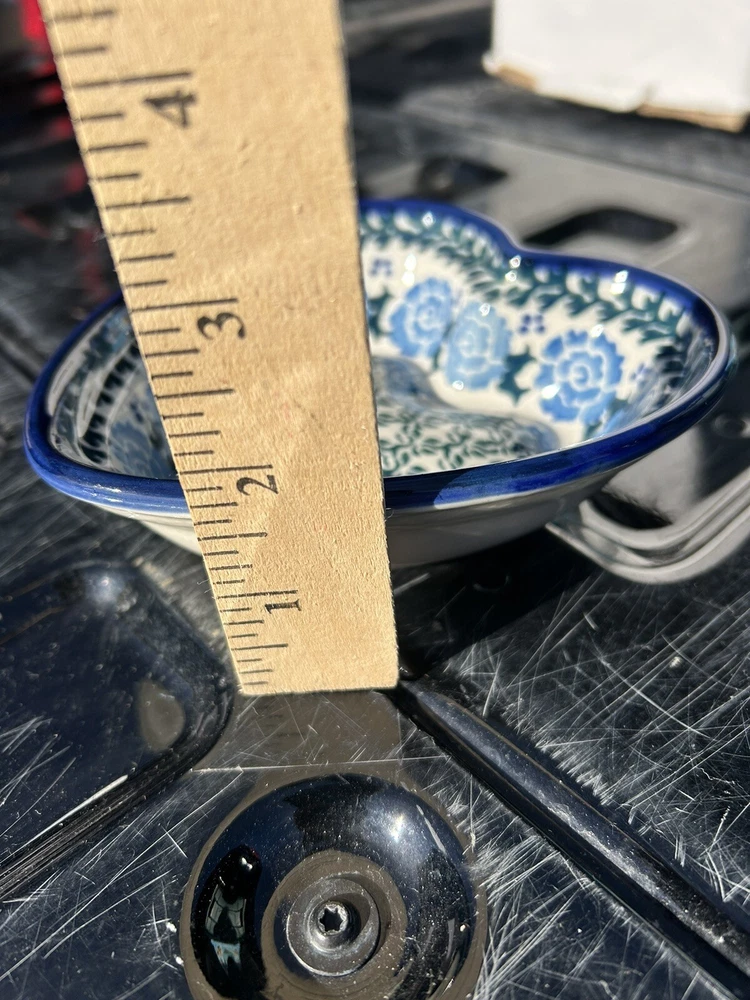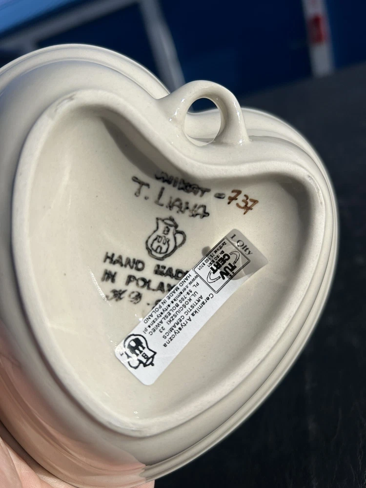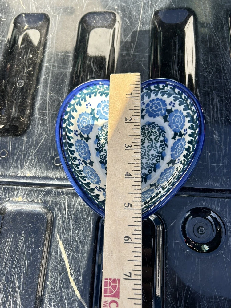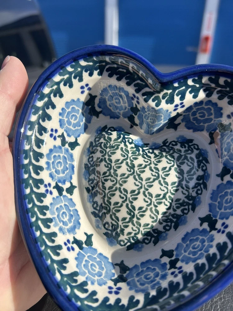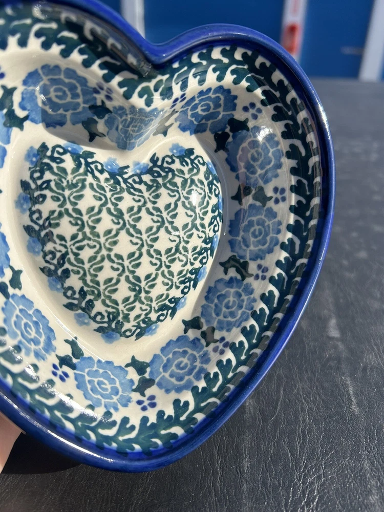 gtin13:Does not applyShape:HeartFinish:GlossyItem Height:5.5"Handmade:YesUPC:Does not applyBrand:UNIKATDepartment:AdultCountry/Region of Manufacture:PolandNumber of Items in Set:OneFeatures:Loop for hangingColor:Blue & WhiteMaterial:PorcelainBackstamp:PaintedType:Decorative BowlOccasion:All OccasionsProduct Line:UnikatProduction Technique:PotteryVintage:YesSet Includes:Decorative dish or candy, dips