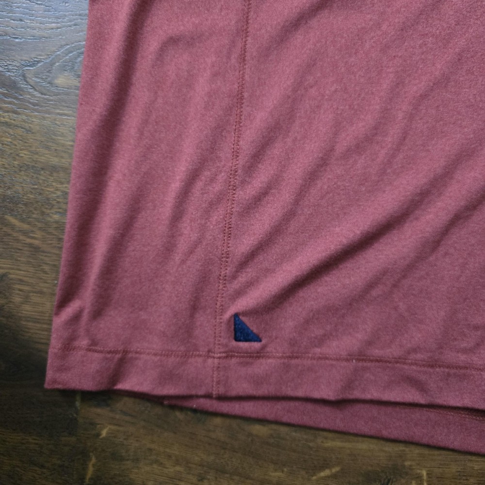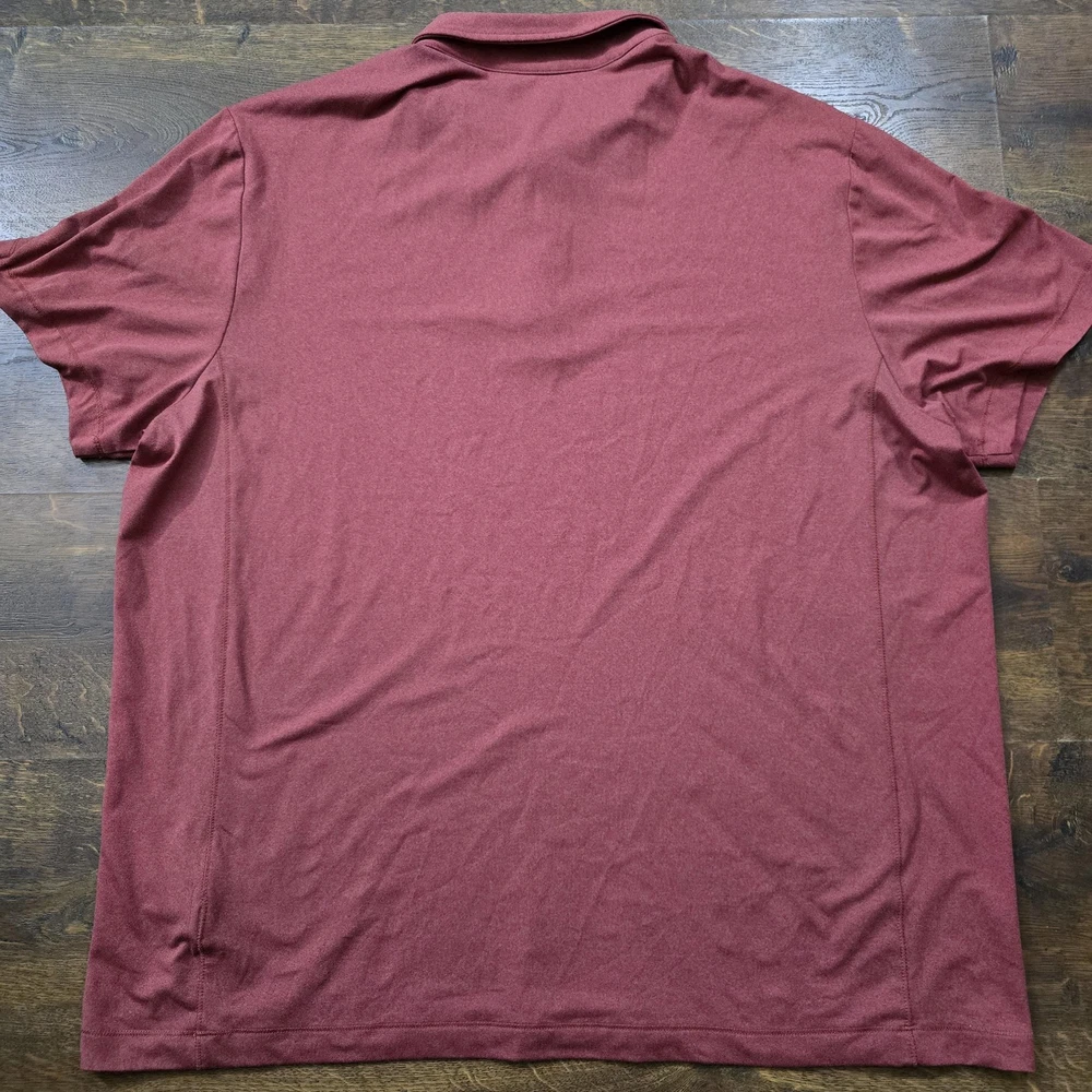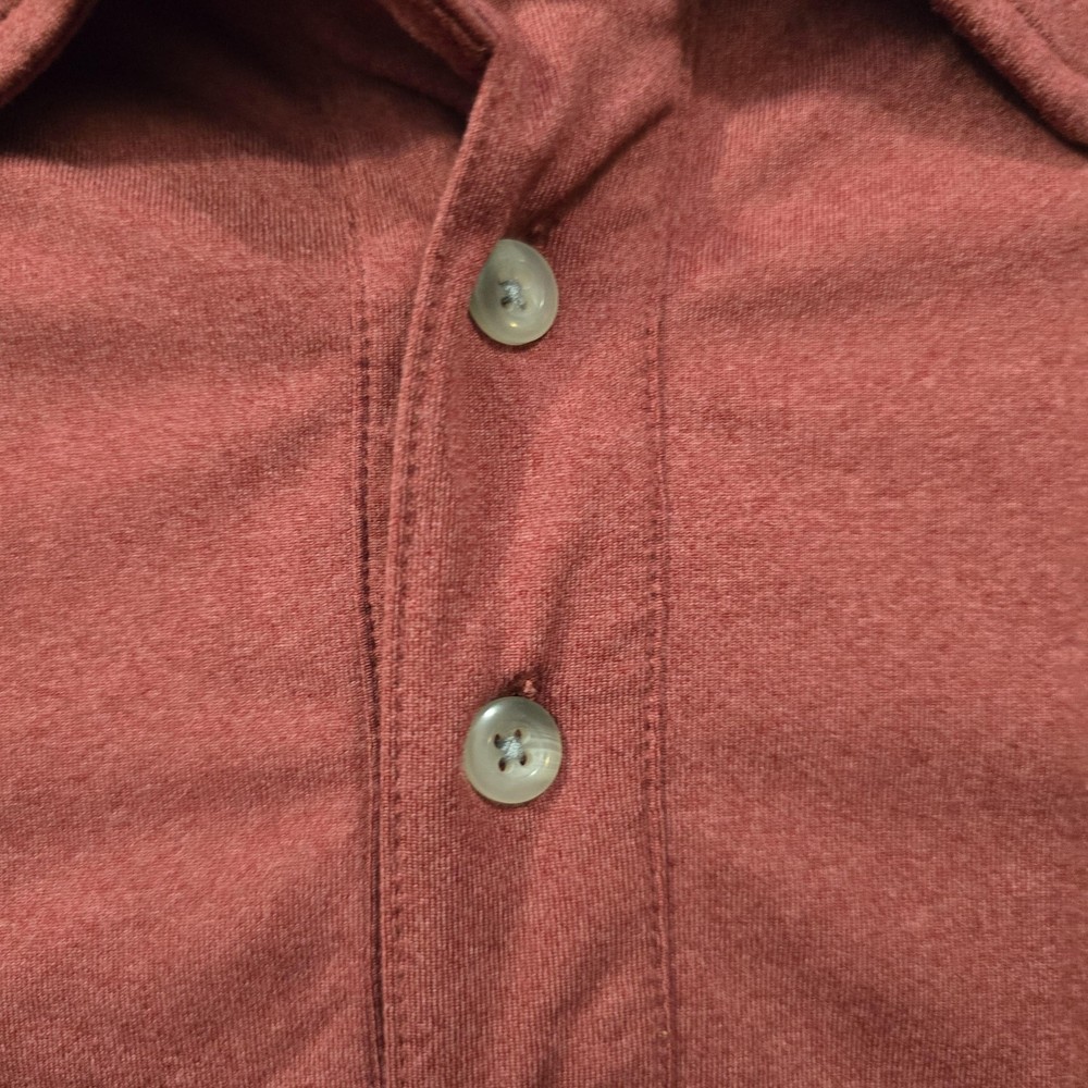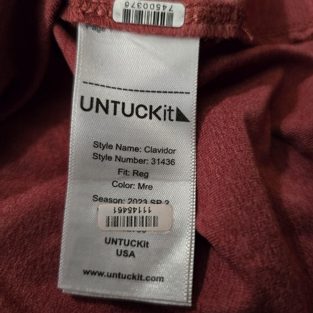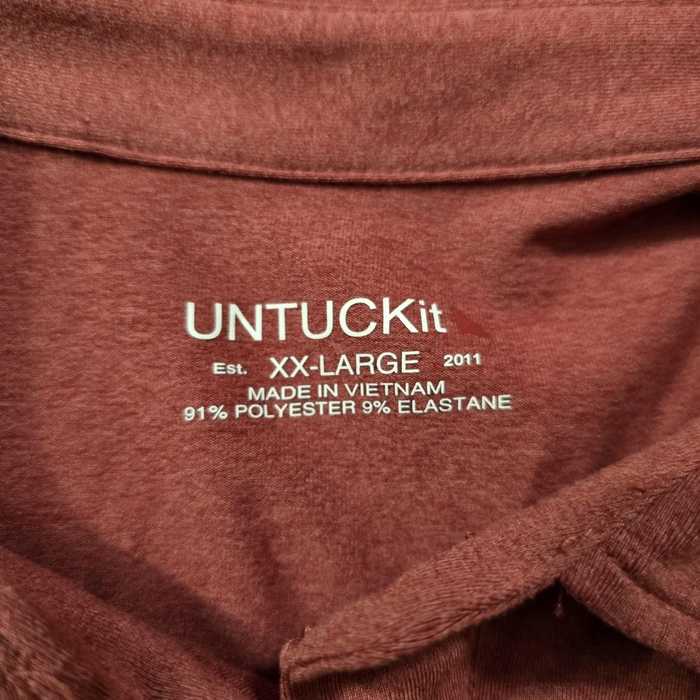 UNTUCKit Polo Shirt Mens 2XL Red Clavidor Stretch Performance Golf Short Sleeve UNTUCKit Clavidor performance polo featuring a solid heathered red jersey knit designed to be worn untucked. Front design includes a three-button placket, point collar, and short sleeves in a classic regular fit silhouette. Back of the shirt is clean and solid red for a simple, versatile look suitable for casual wear or the golf course. Small navy triangular UNTUCKit logo patch accents the front hem with tonal stitching along the seams. Tag size: XX-Large (Mens regular fit). Material: 91% polyester, 9% elastane (spandex) stretch jersey for comfort and ease of movement. Printed inner neck label shows UNTUCKit branding, size information, fabric content, and Made in Vietnam details. Inner side tag lists Style Name: Clavidor, Style Number: 31436, Fit: Reg, Color: Mre, Season: 2023 SP 2. Additional tag barcode number: 74500376. Great UNTUCKit performance polo for office casual outfits, travel days, or relaxed weekend golf rounds.