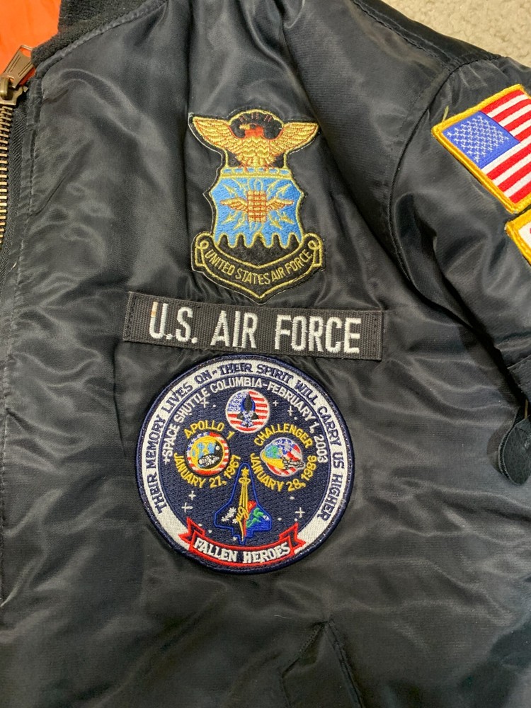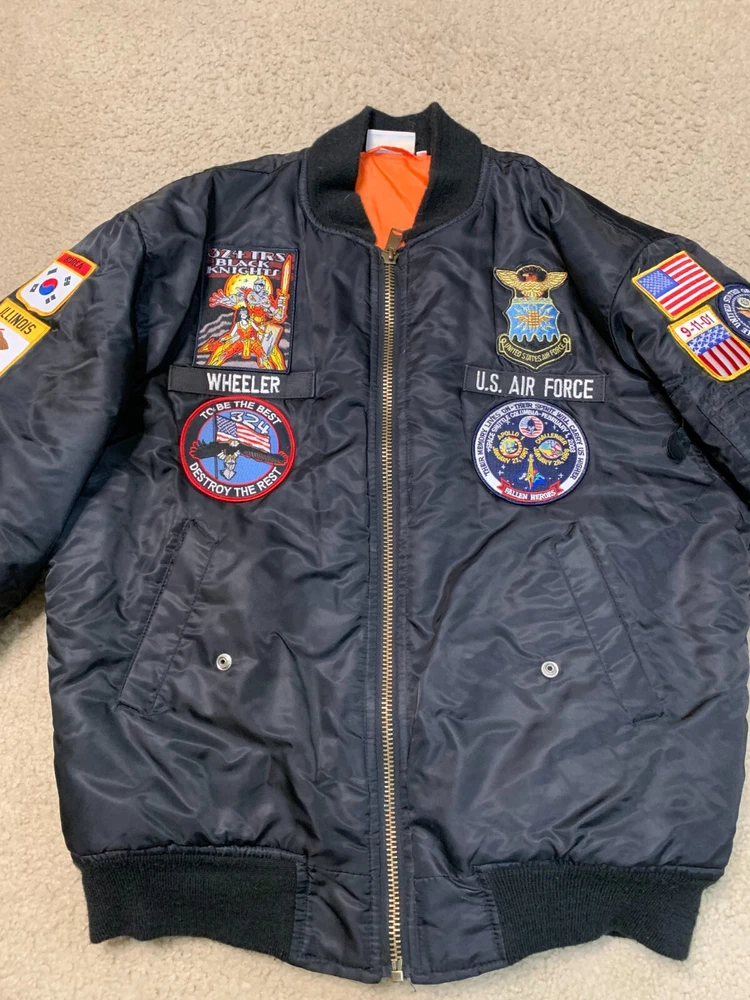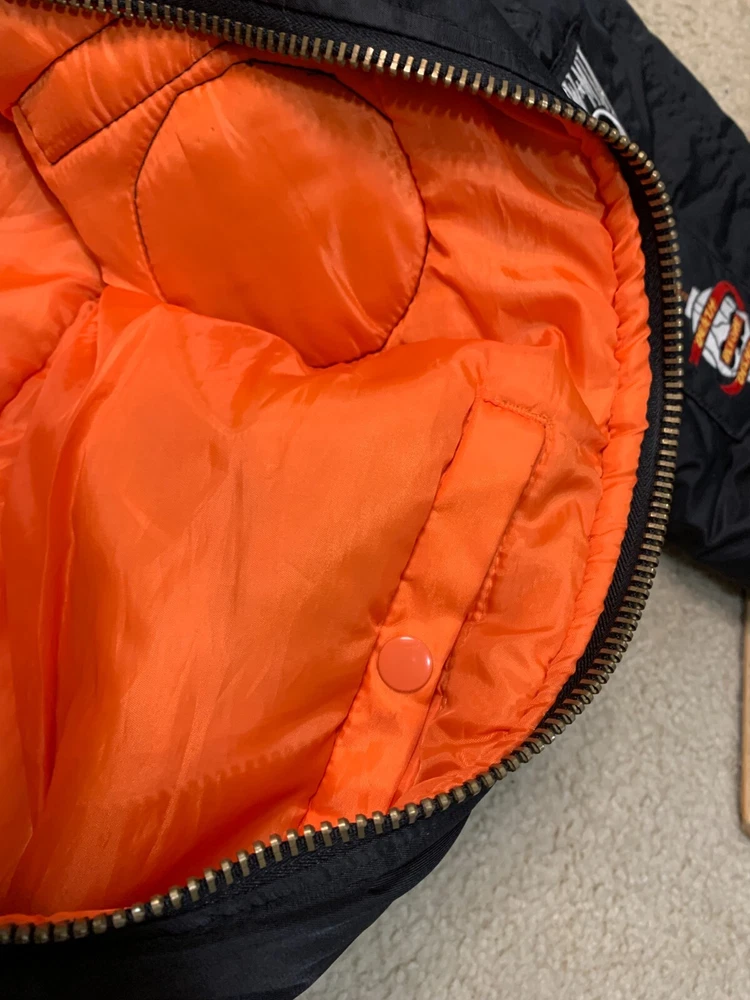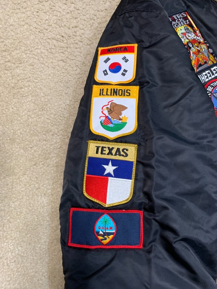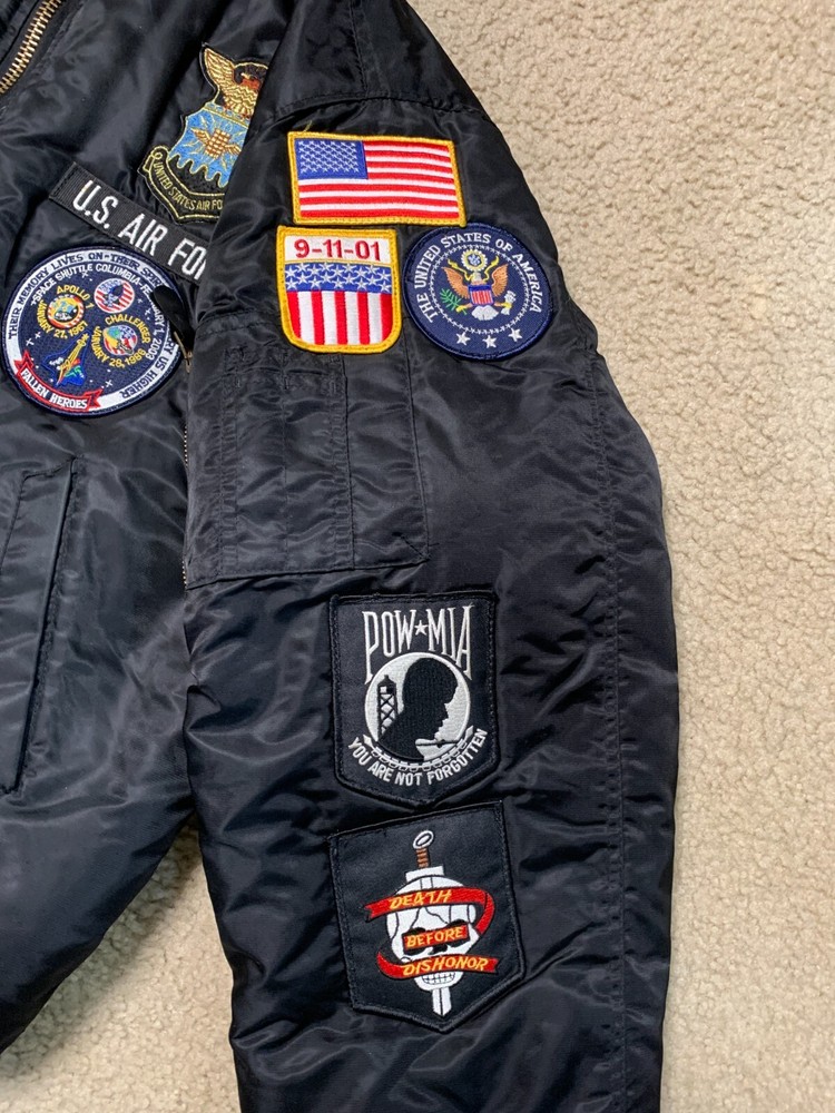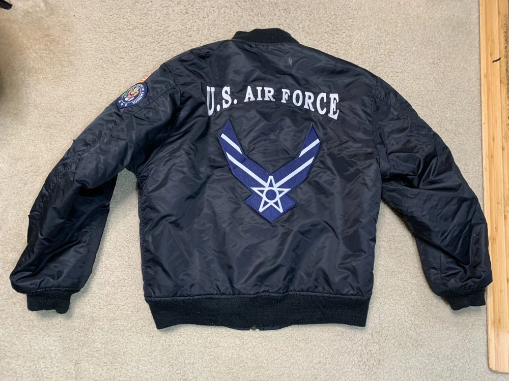 Get ready to rock the U.S. Air Force Nylon Bomber Jacket by My Force! This black bomber jacket is made of high-quality nylon material and features a full zip closure. The jacket is embroidered with a logo and zipper accents, giving it a stylish look. The jacket is available in size L and is a regular fit for men. It is perfect for winter, fall, and spring seasons and is made in China. The vintage jacket has a USA theme and is great for those who love Flight brand. The lining of the jacket is also made of nylon, ensuring comfort and durability. All of our items are shipped from a SMOKE-FREE environment.