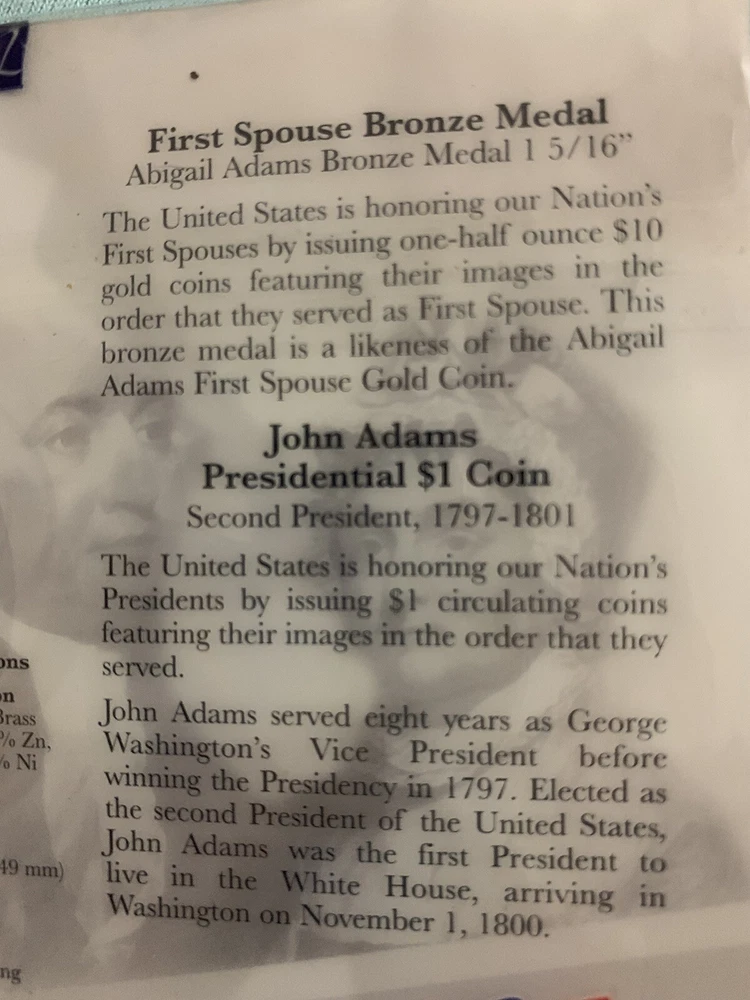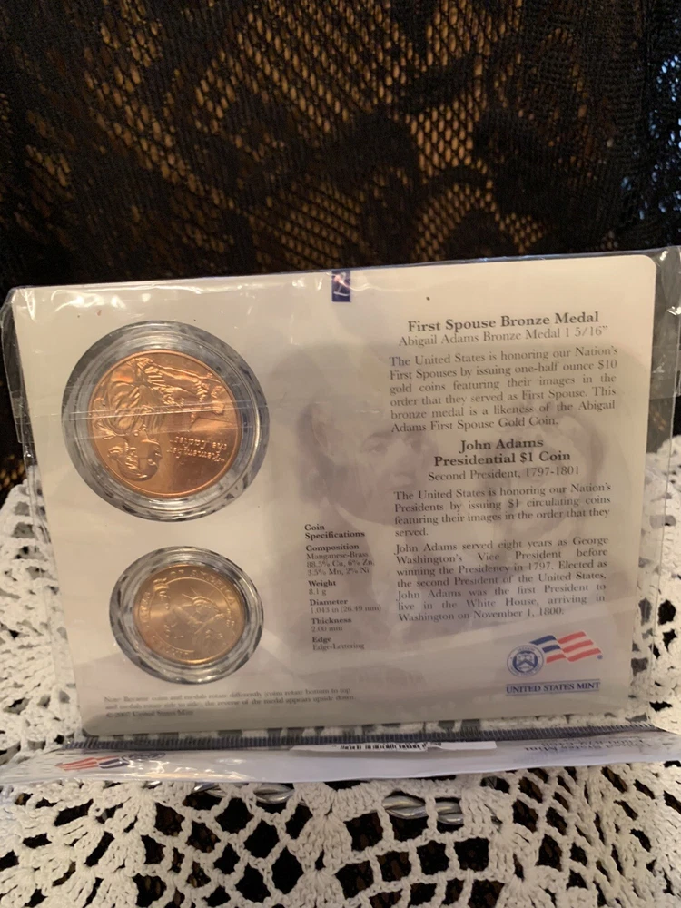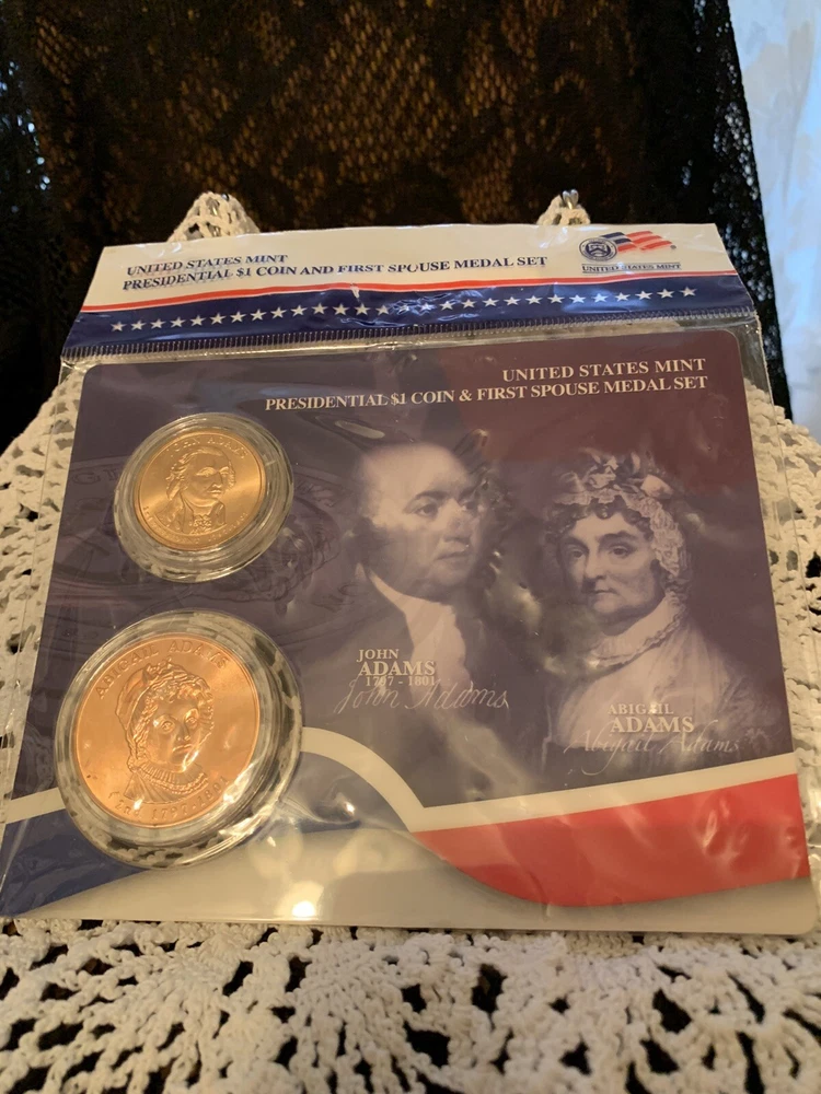 US Mint Presidental $1 Coin & First Spouse Medal Set. John & Abigail Adams ***Uncirculated*** ***Ungraded*** Packaging & coins are in excellent condition. All packaging is original and has never been opened. They have been in a storage tote w/assorted coin sets. Please look at all pictures for details ***I ship within 24hrs after payment is received unless it’s the weekend or a holiday then it’s the next business day *** Shipped USPS Ground Advantage Mail