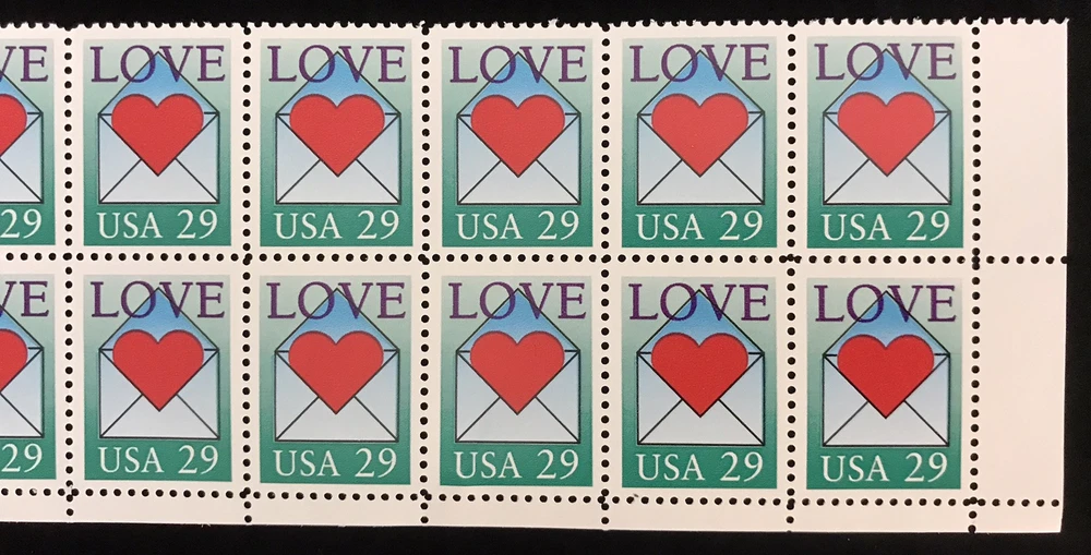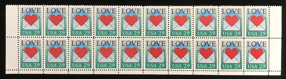 US Stamp Scott #2618, 29c, Love Issue, Heart / Envelope 2x10 Block (20 Stamps) Nice condition. See pictures for details.
